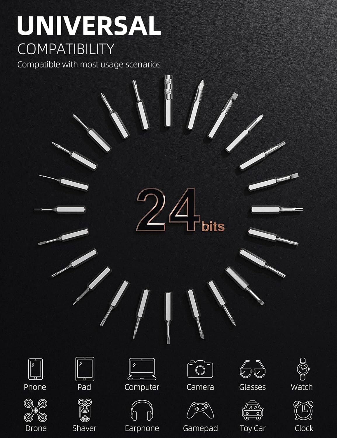 - Precision Screwdriver Set with 24 bits:This mini screwdriver set includes 24 high-quality self-magnetic bits made from durable S2 hardened steel. It comes with a Mini Electric Screwdriver, Clip Storage Case, Micro USB Charging Cable, and User Manual, offering everything you need for various repair projects.