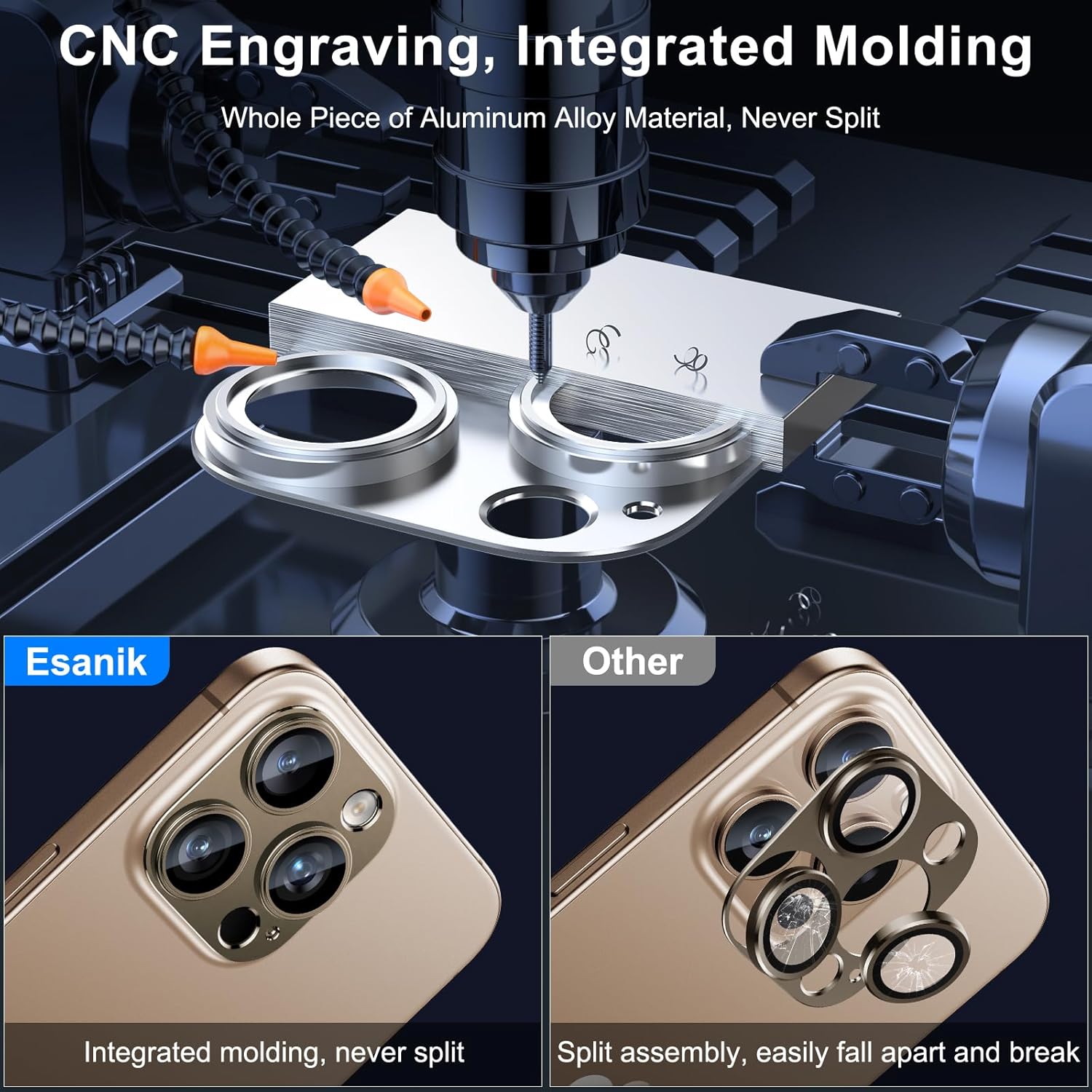 - 【CNC Engraving & Integrated Molding】 Esanik 2024 Upgrade Version iPhone 16 pro max / iPhone 16 Pro Cam Cover is precisely carved from whole piece of high-quality aluminum alloy, firm and long lasting. Bid farewell to the split and falling apart issues resulting from the conventional split assembly process.