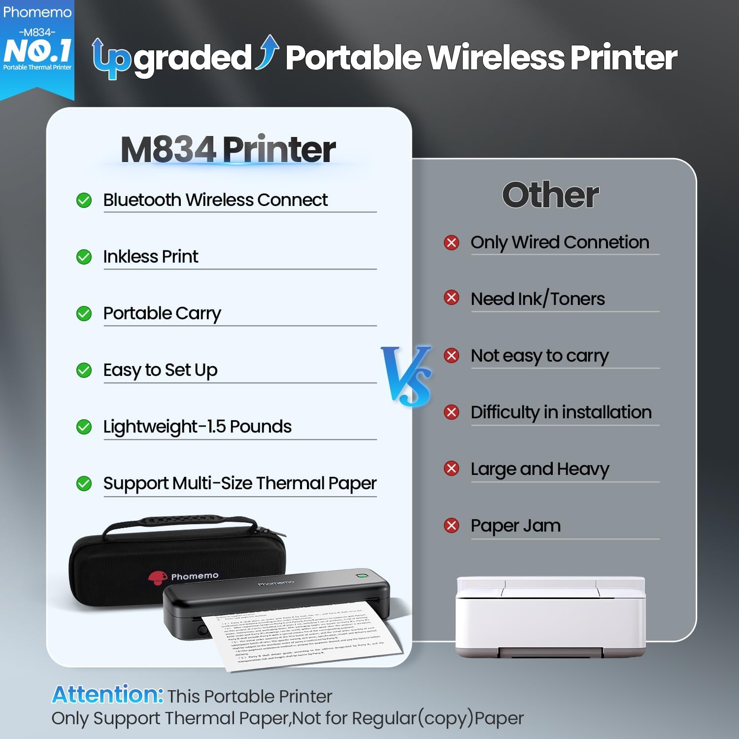 - Extended Battery Life: M834 wireless portable travel printer equipped with a 2600mAh rechargeable battery, the Phomemo M834 printer boasts 116% more capacity than other thermal portable printer, allowing for over 160 pages of continuous printing without power worries.