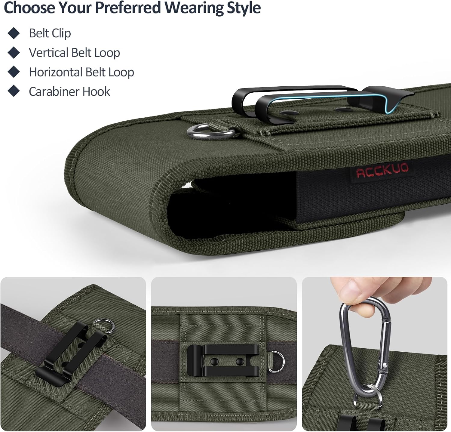 - Versatile Wear Options: Includes a custom belt clip for a secure fit, addressing common slipping issues. Also features horizontal and vertical belt loops, and a carabiner for flexible carrying options