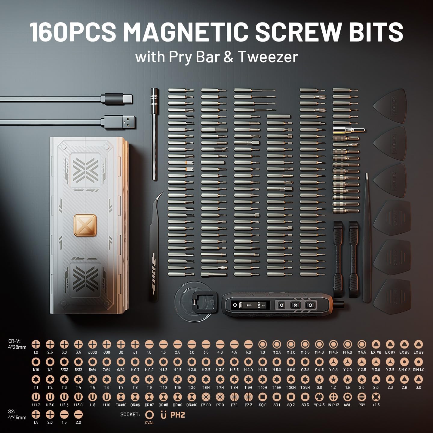 - 【Perfect for Families and DIY Enthusiasts】With 160 precision bits in 26 types (PH1, PH2; H3, H4, H5, H6; SL4, SL5; TR20, TR25, and more), this electric screwdriver kit meets every household need, covering all possible screw sizes and types. Thus, it's the perfect gift for families or DIY enthusiasts with its innovative features and stylish futuristic aesthetics.