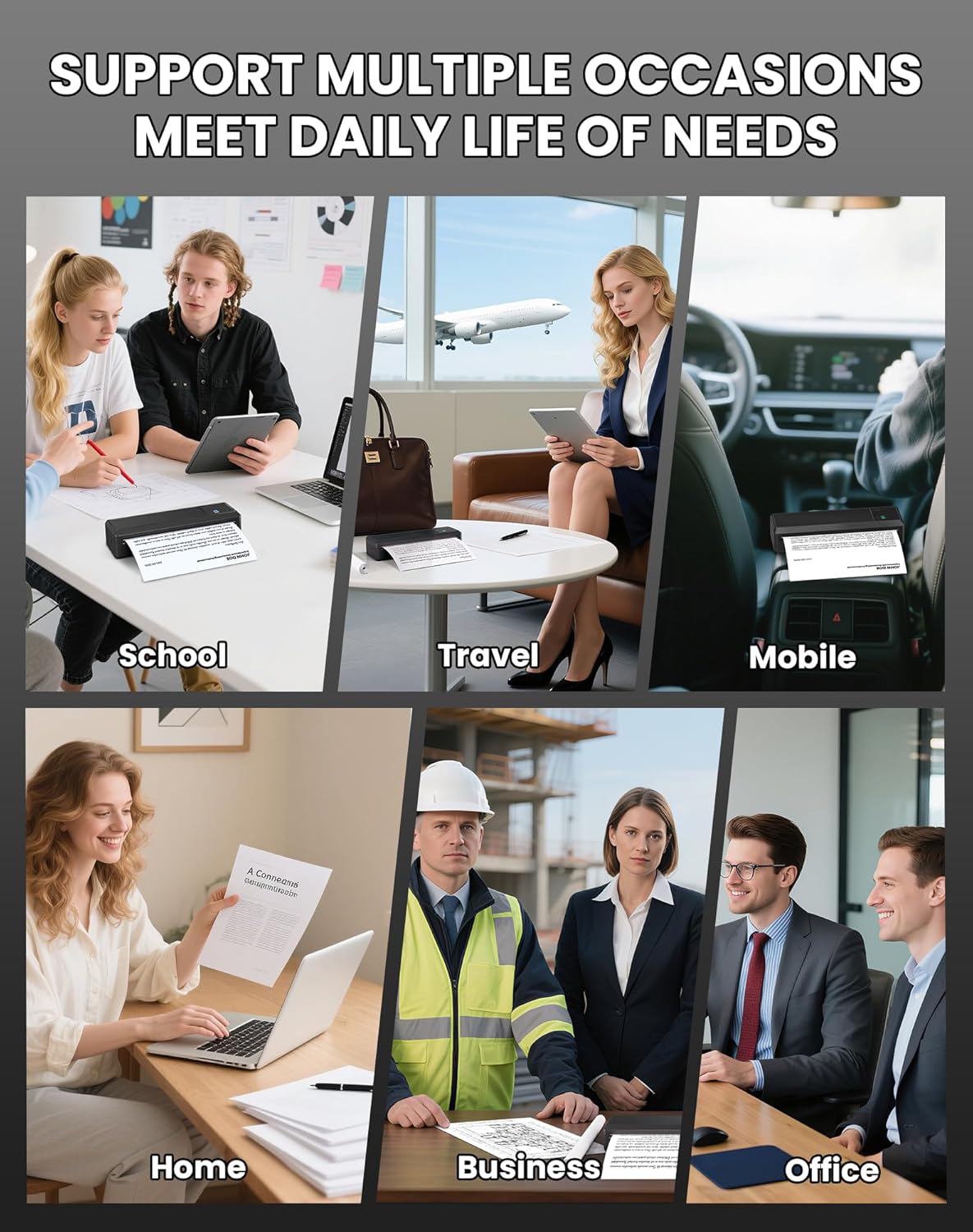 - Portable & Lightweight Design: This portable printer weighs only 1.43 pounds and can be easily placed in a backpack or briefcase. Whether you are in the car, home, travel, work, meetings or during university for use, this portable printers can help you, especially in emergency situations where you need to print contracts, office documents, inventory lists, business checks, shipping labels, boarding passes, etc. With this mobile inkless printer can enjoy convenience of printing anytime, anywhere