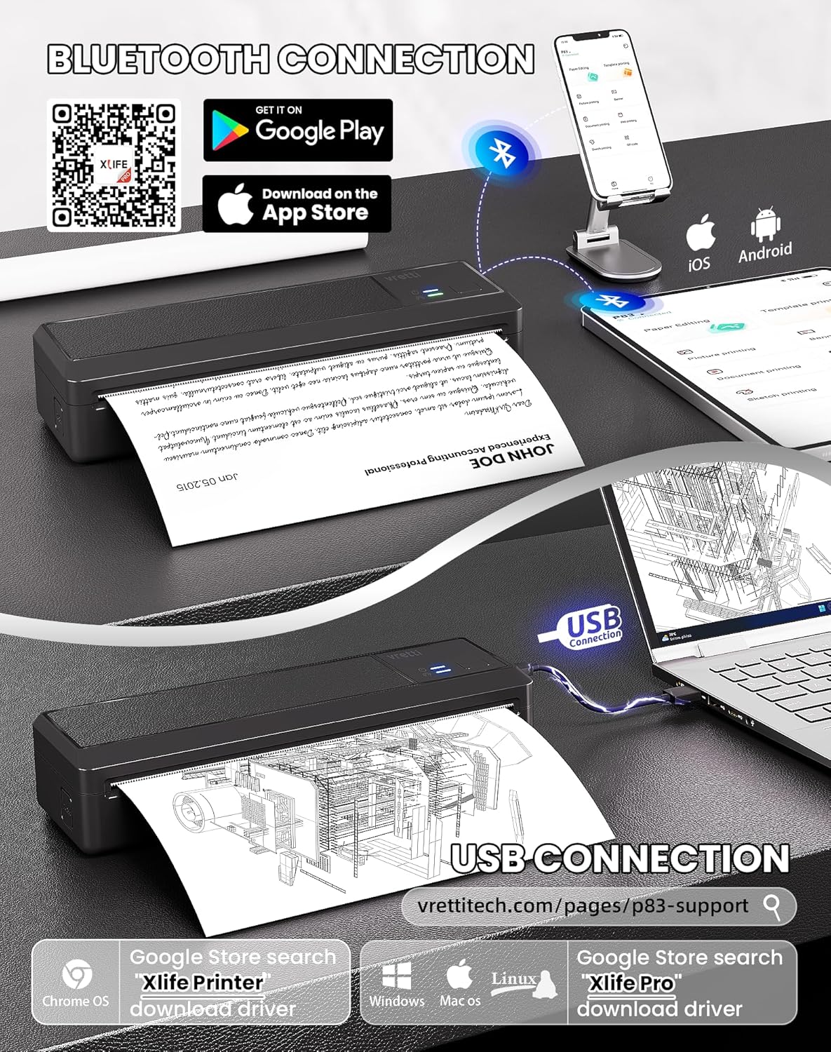- High Compatibility: The portable printer can be connected for phone or tablet via bluetooth for printing, and can also be connected for laptop or computer via USB for printing. Easy to set up, install use. This portable printers wireless for travel is compatible with iOS, Android, Windows, Mac OS, Chrome OS & Linux systems. Note: that you need to download the corresponding application or driver before using this inkless portable thermal printer 8.5 x 11