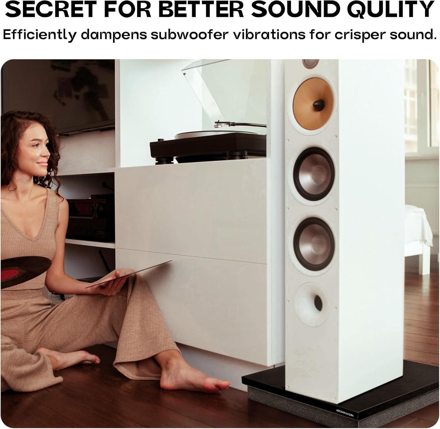 - Enhanced Sound Clarity: Using subwoofer isolation pad can significantly reduce the vibration and helps to eliminate unwanted levels of audio resonance by the subwoofer, speaker isolation pads ensuring that the speaker provides clear, undistorted audio output. Subwoofer pad perfect for stage or studio use, it is an ideal choice for apartments and studios.
