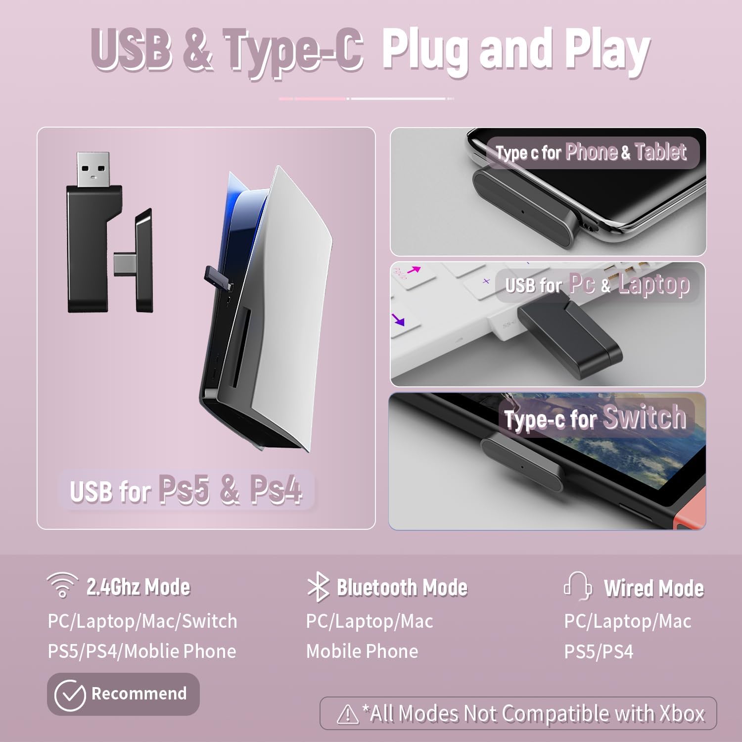 - Wide Compatibility with Gaming Devices -- Wireless gaming headphones 2.4GHz connector connects seamlessly to Ps5, Ps4, PC, Mac, Laptop, Switch. Bluetooth mode is only available for laptop, phone, and switch (Mic function is not supported). 3.5mm audio jack wired mode (music and calls only).