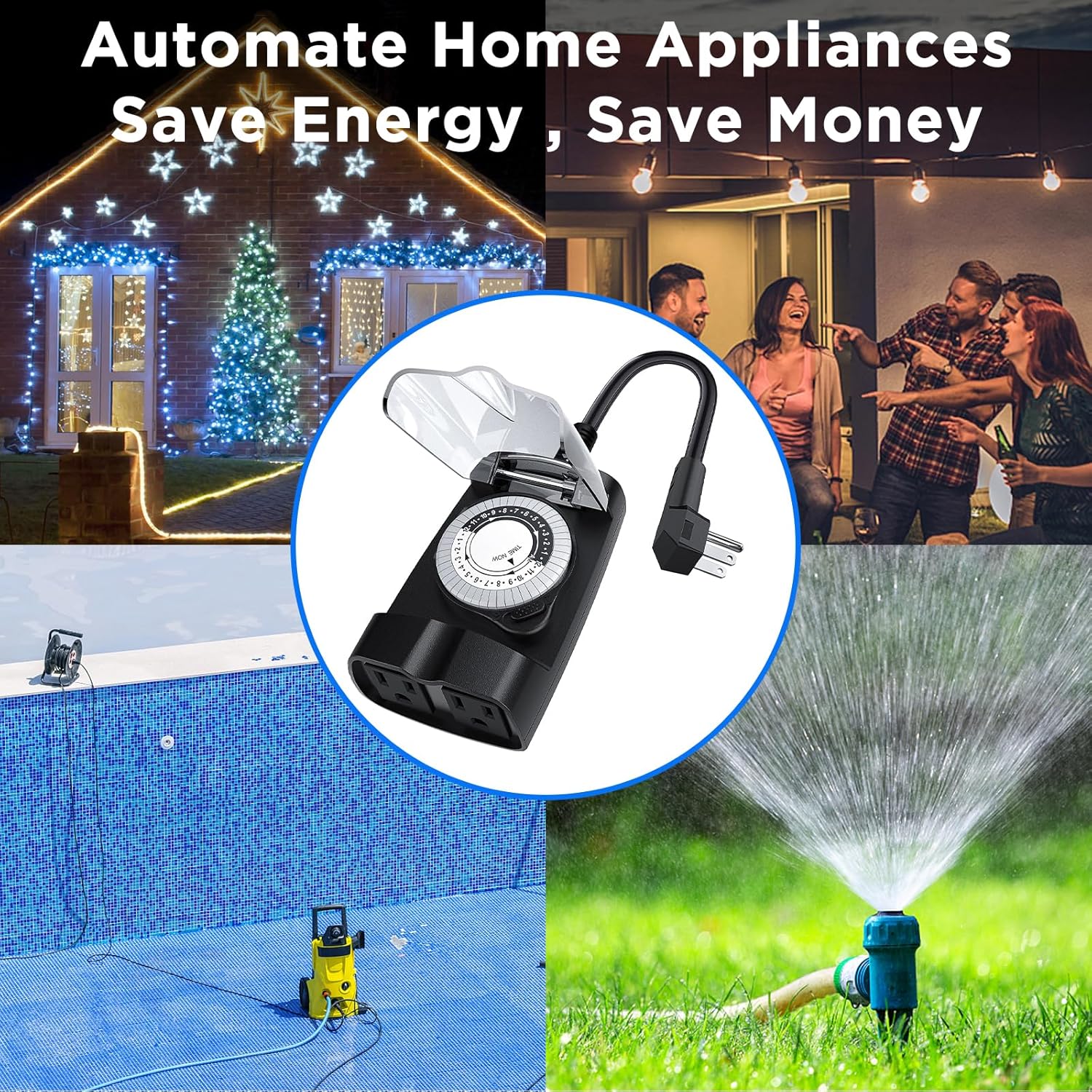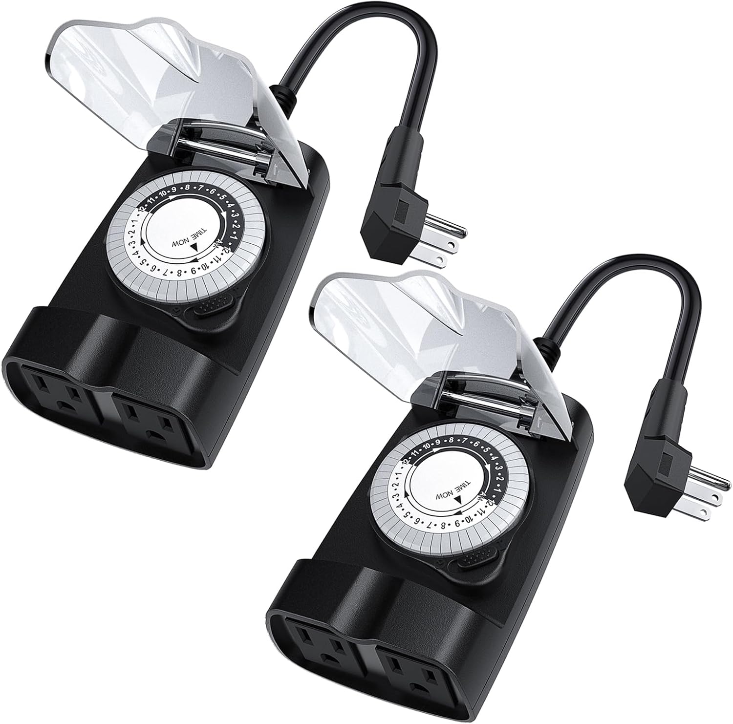 - [Use Every Where] The outlet timer outdoor features dual 3-prong grounded outlets and 6 inches UL approved PVC cable which allows for safe and reliable connection of electrical devices. It is compatible with a wide range of plug types and can be used with both indoor and outdoor appliances. 2 Packs can be used one as pool timer for pool pump, another one as outdoor light timer for outside light/lamp at two different places.