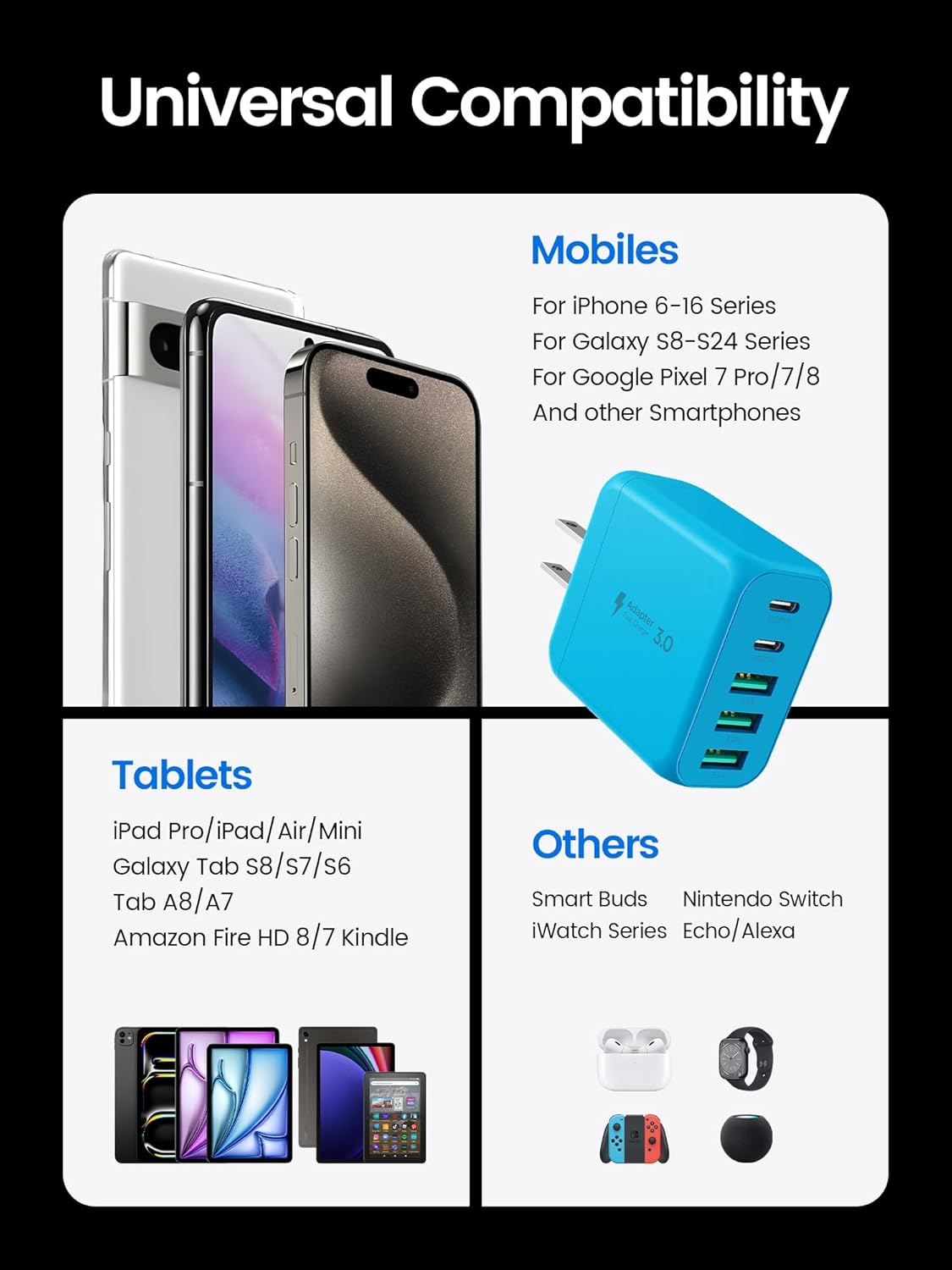 - Works with All Devices:Thanks to its special 5-port design, this USB-C charger plug is compatible with nearly all electronic devices. It works with iPhone models from 7 to the latest iPhone 15, various iPad models, Samsung Galaxy phones including the S24 and Note series, as well as LG, Motorola, Google Pixel, Apple Watch, AirPods, Samsung Watch, Galaxy Buds and many other digital devices.
