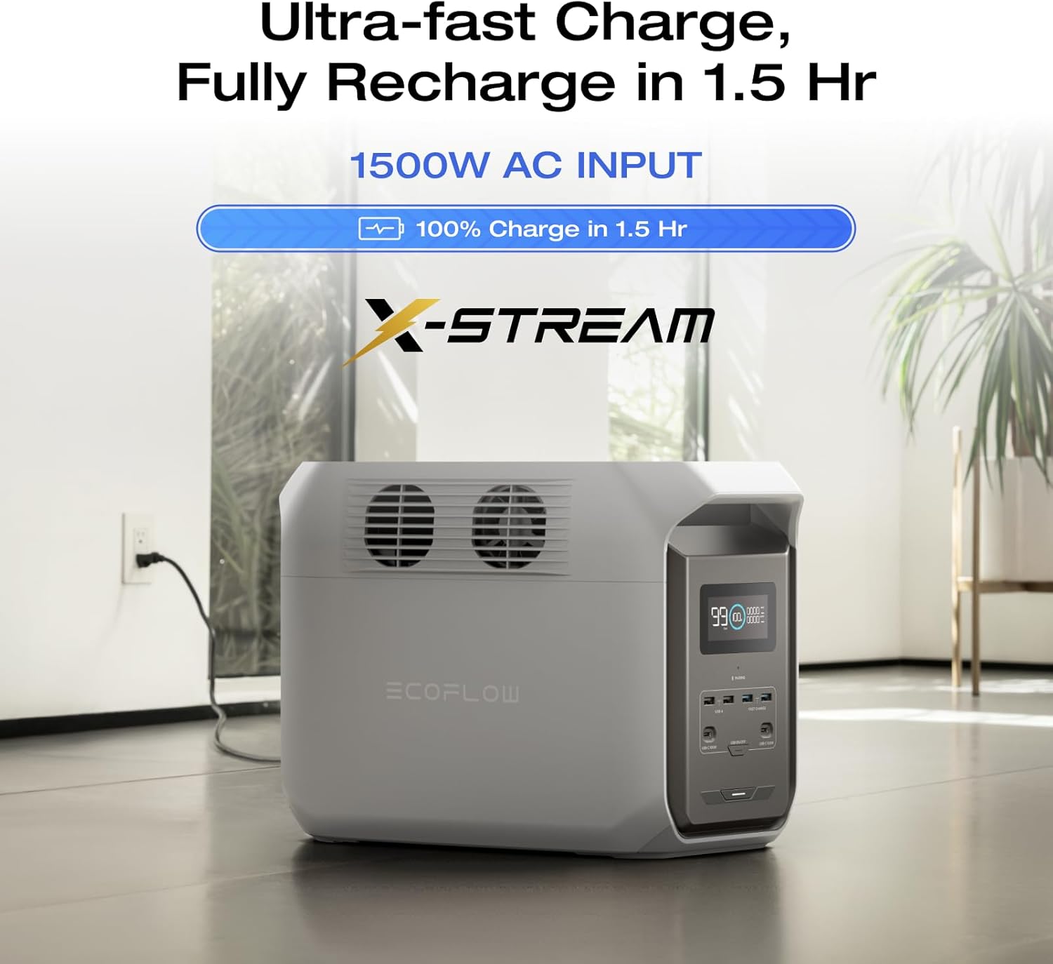 - [Ultra-Fast Charging, 0-100% in 1.5 Hours] With a 1500W AC input, the EcoFlow Delta 3 1500 portable power station charges from 0 to 100% in just 1.5 hours. Solar charging takes only 3.5 hours. The 800W EcoFlow Alternator Charger can fully charge it in 2.1 hours. Both the EcoFlow Smart Generator and Hybrid Charging (AC + PV) options also deliver a full charge in 1.5 hours. Whether you're at home or on the go, this electric generator ensures you're always ready.