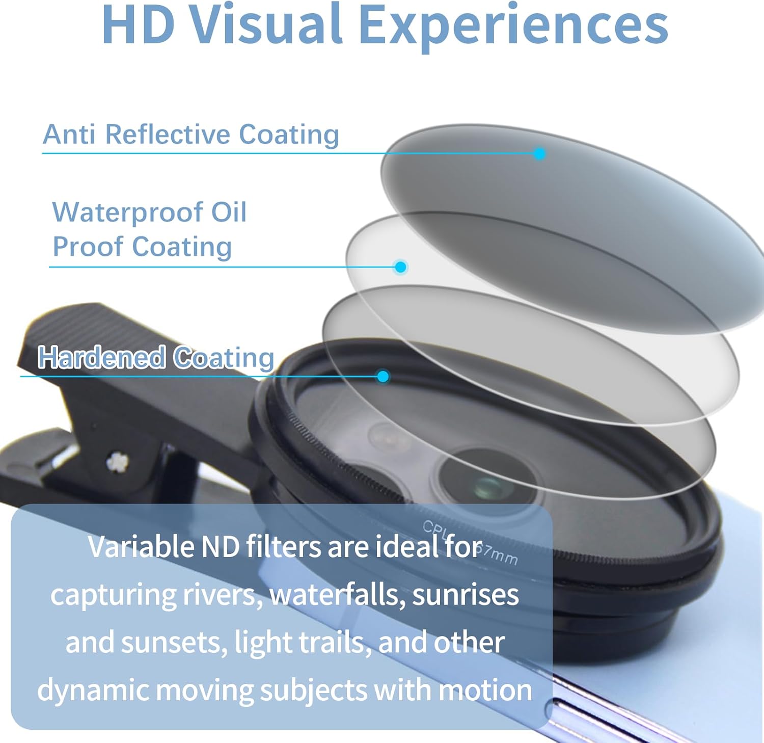 - CPL Filter: Let your phone take pictures like a professional camera. Polarizing filter can eliminate reflections from non-metallic surfaces, reduce or eliminate glare, enhance the contrast and saturation of pictures, such as lakes, blue sky, clouds, glass, etc., making your photos and videos more realistic.