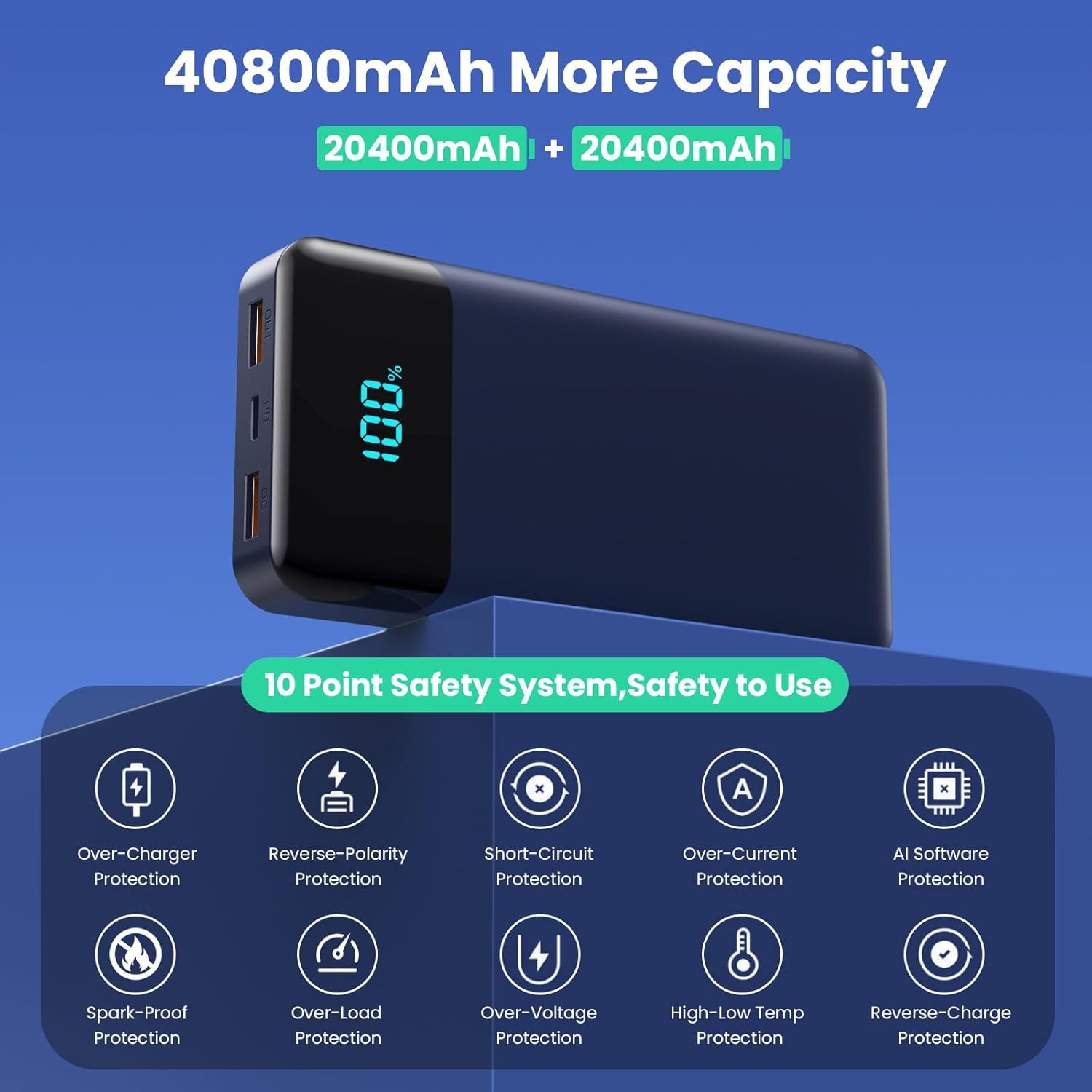 - 40,800mah Power Bank with 3 Built in Cables charges 5 devices simultaneously and recharge itself with 2 options(USB A cable,USB C port),which is great for multi electronic devices users. USB C port serves as both input and output, fits iPhone 16/15 and all upcoming USB C devices.