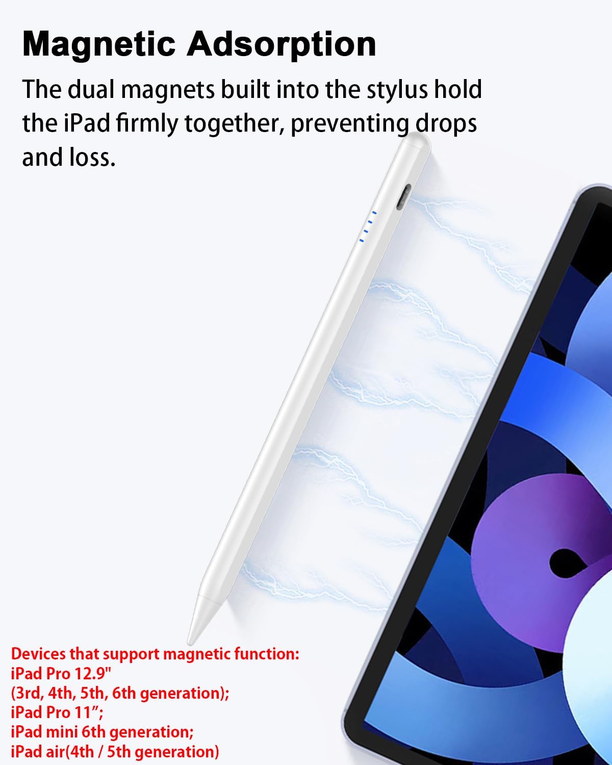 - ăPalm Rejection / Magnetic Functionă The stylus pen for ipad has Palm Rejection function, no need to wear gloves when writing, you can rest assured that your hand on the screen drawing, for your fine writing Drawing convenience. This iPad Tablet Pen is also built-in two magnets, which can be attached to the side of iPad Pro 11-inch (1/2/3 Gen), iPad Pro 12.9-inch (3/4/5 Gen), iPad Air (4/5 Gen), and iPad mini 6, so it never scrolls away. (Note: This stylus pen does not support wireless charging)