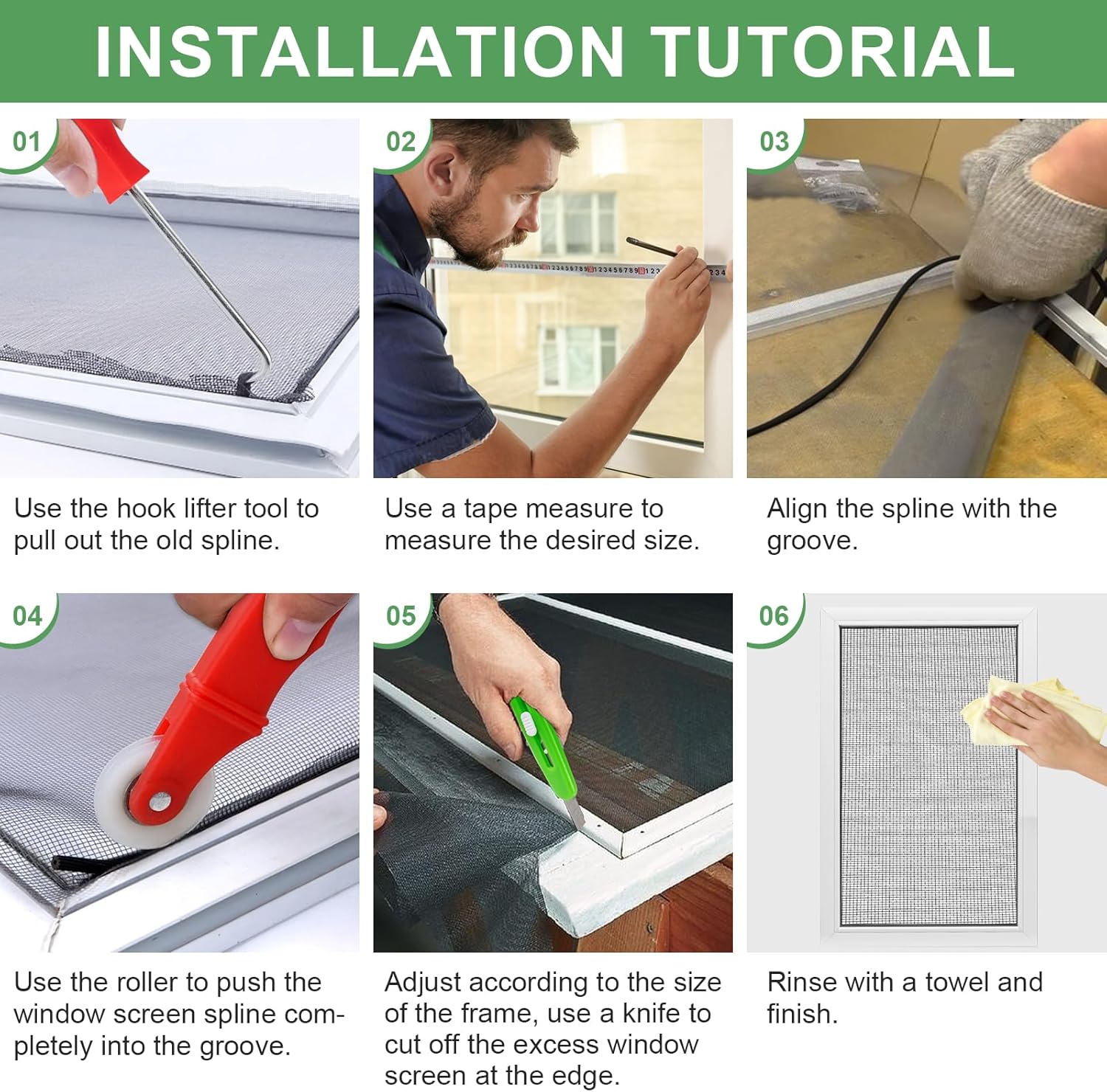 - 6 in 1 Window Screen Replacement Kit: Window screen repair kit more comprehensive professional. Includes window screen, rolling tool, spline, removal hook, (knife, tape measure color random). Window screen door repair kit provides you with everything you need for repair