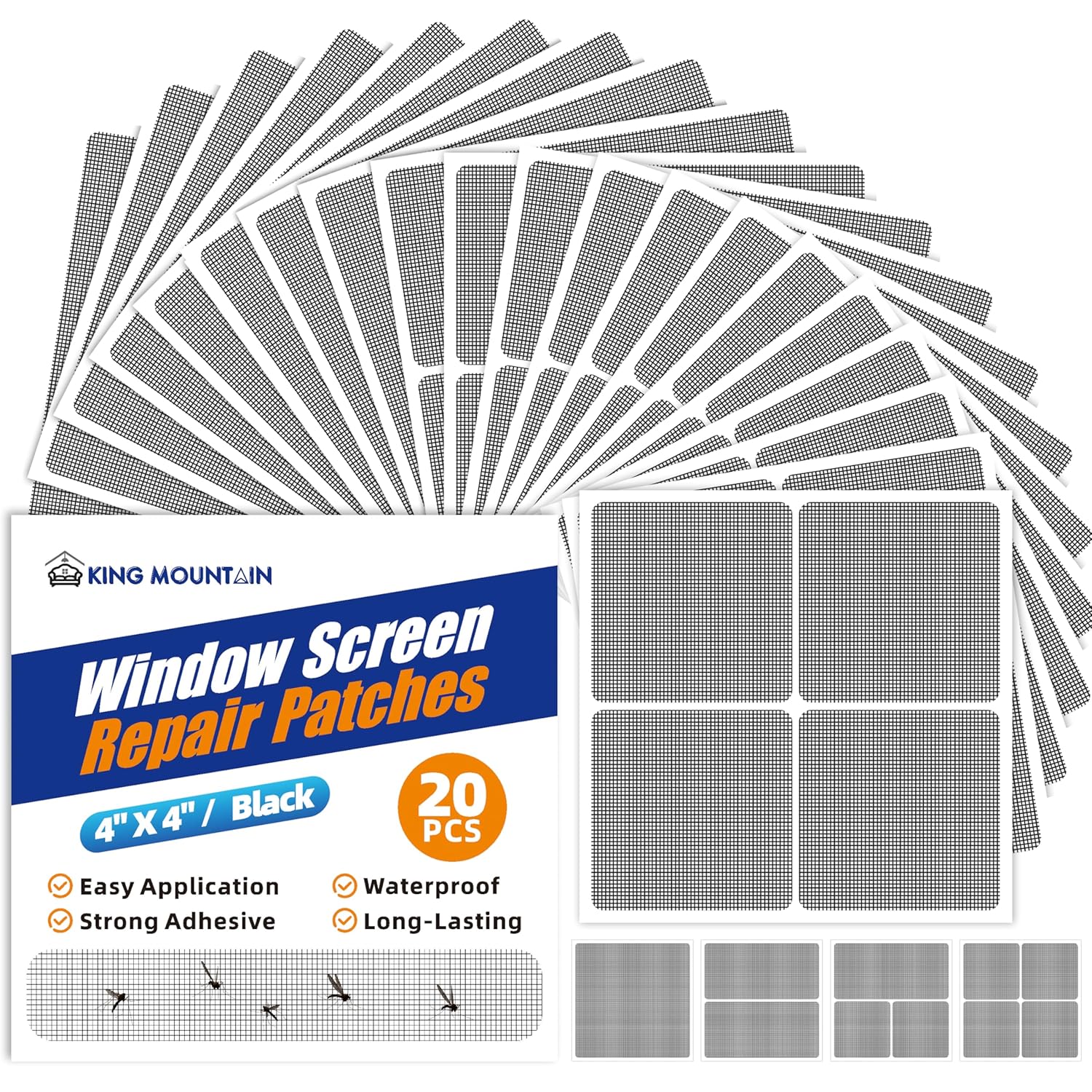 KING MOUNTAIN 20 Sheets Black Window Screen Repair Patches,4×4 in Window Screen Repair Kit for Window Screen and Screen Door Tears Holes, Strong Adhesive Screen Tape Mesh Repair,Quick & Waterproof