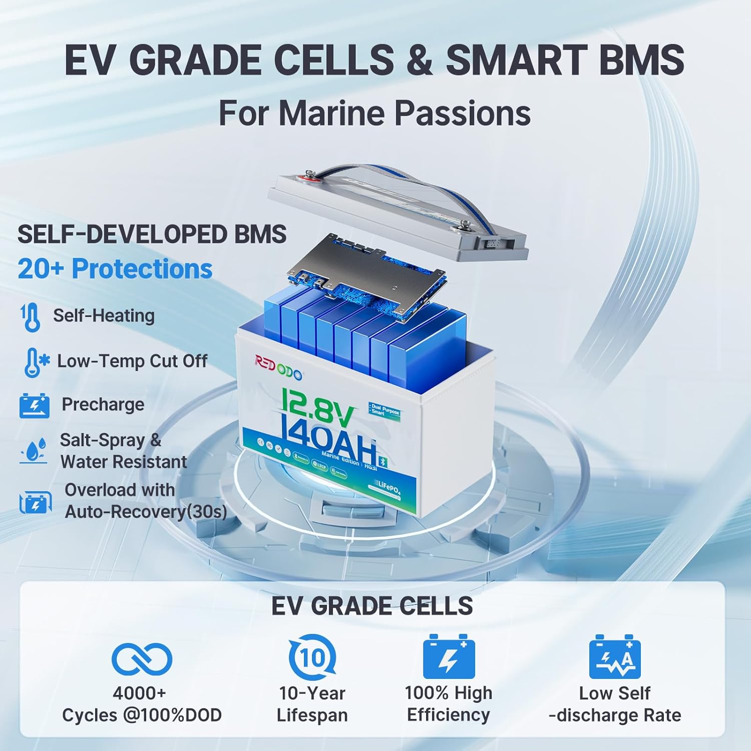 - 【Marine Starting Battery Plus Deep Cycle Performance】Redodo 12 volt 140Ah dual purpose marine battery offers 1000 CCA (Cold Cranking Amps) and 1200 MCA (Marine Cranking Amps), born for cranking up fuel powered marine outboard motor.