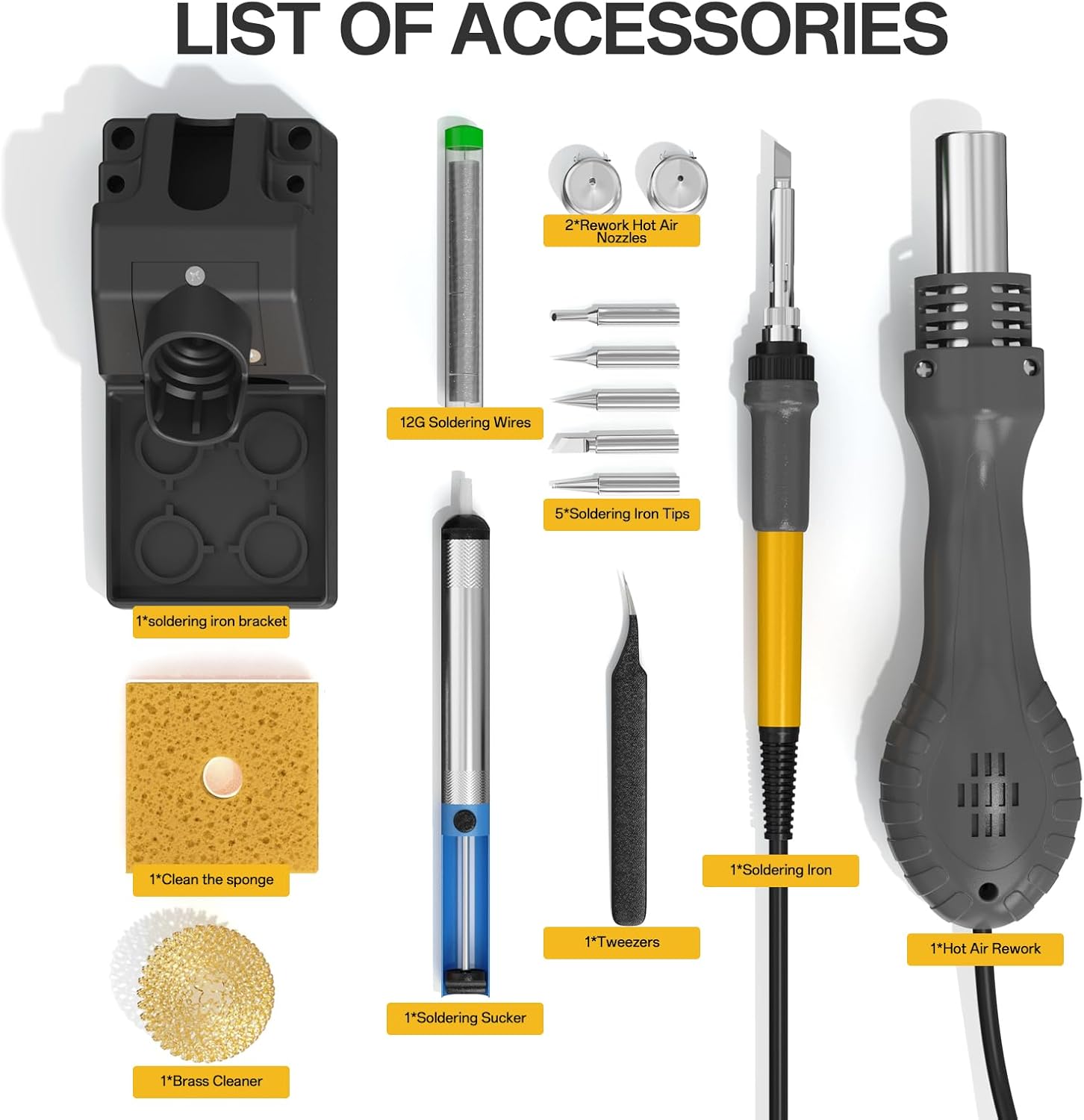 - 【Necessary Solder Accessories】The electronics soldering kit includes one soldering machine with hot air rework station and soldering iron station, 5 solder iron tips, 1 hot air nozzle, 1 solder sucker, 1 ESD-safe tweezers, 1 soldering wire, 1 brass tip cleaner and instruction manual.
