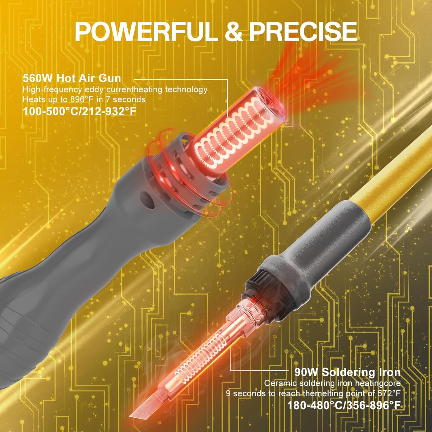 - 【Precise Temperature Control】 This professional solder kit has a maximum output of 650W. Our Hot air reworker with high quality nickel-chrome heating core, high temperature resistance, fast heating up.the temperature of the soldering station can be adjusted from 356-896°F with a maximum output of 90W, the temperature of the hot air gun can be adjusted from 212-932°F with a maximum output of 560W.