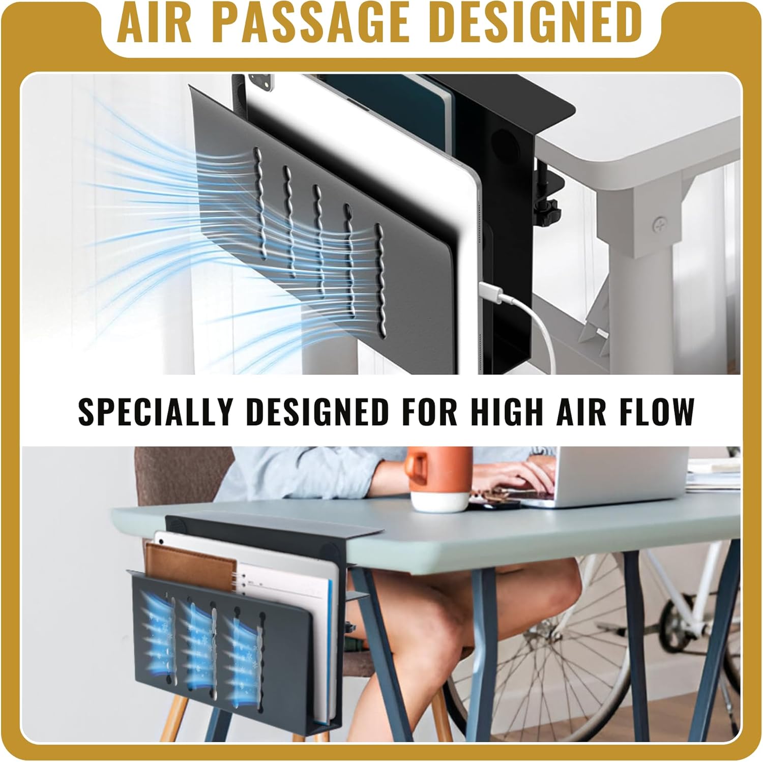 - VERSATILE DESK SIDE STORAGE WITH ANTI-SLIP BASE & CLAMP PADS: Our metal hanging desk organizer is crafted from high quality stainless steel, This under desk laptop holder securely holds laptops, tablets, cables, notebooks & more, preventing scratches and slips.