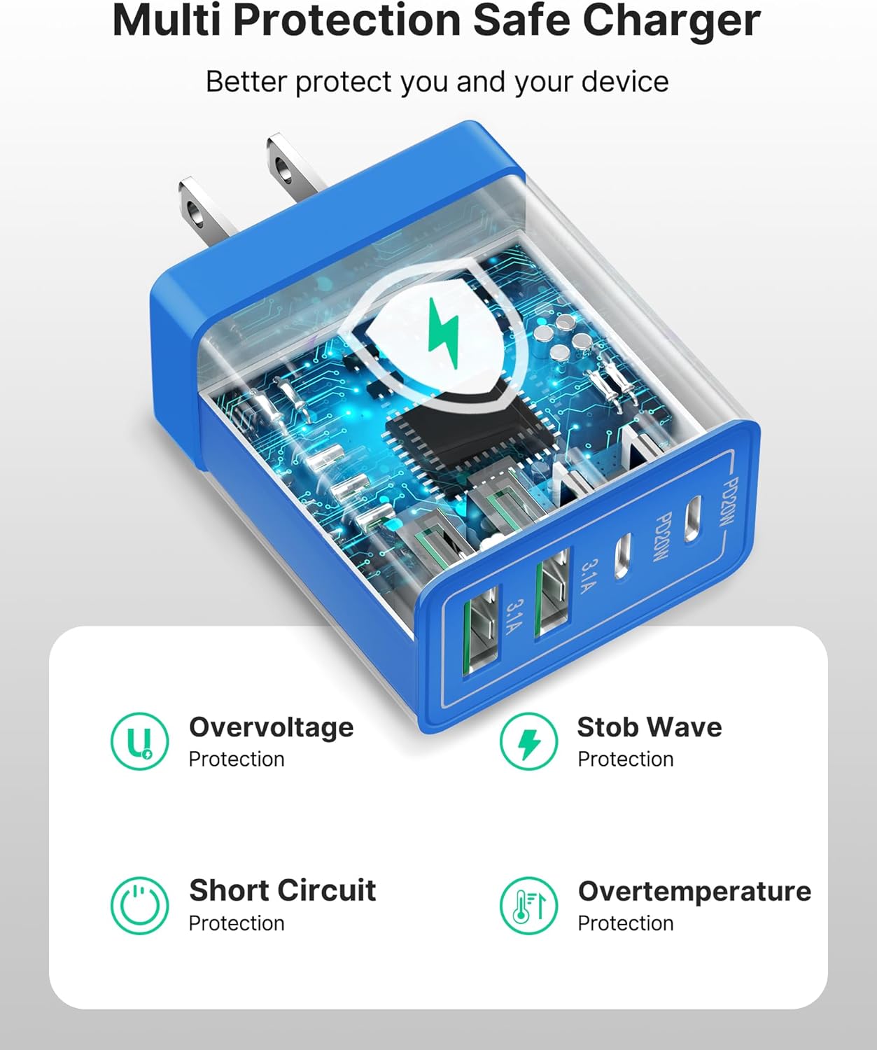 - 【Safe and Reliable Phone Charger】:The wall charger brick built-in safeguards protect your devices against excessive current, overheating, and overcharging, the charger block will automatically stop charging when power is full to protect your device.The USB C Charger plug is made of ABS + PC fireproof material,ensuring that your digital device always charges safely