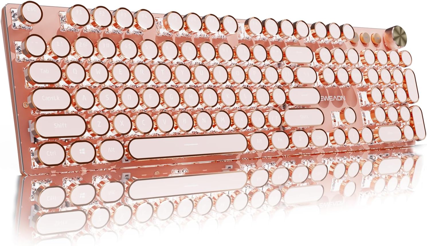 - 【Retro Typewriter Mechanical Keyboard】:The typewriter gaming keyboard has mechanical custom pink switches that feature a smooth linear feeling, and low resistance without a tactile bump feel. round keycaps of the punk mechanical keyboard look like a classical typewriter. Keycaps have a matte texture and upgraded touch feel and the sound is quiet when the button is pressed lightly giving you a comfortable typing feeling and a stable click touch.