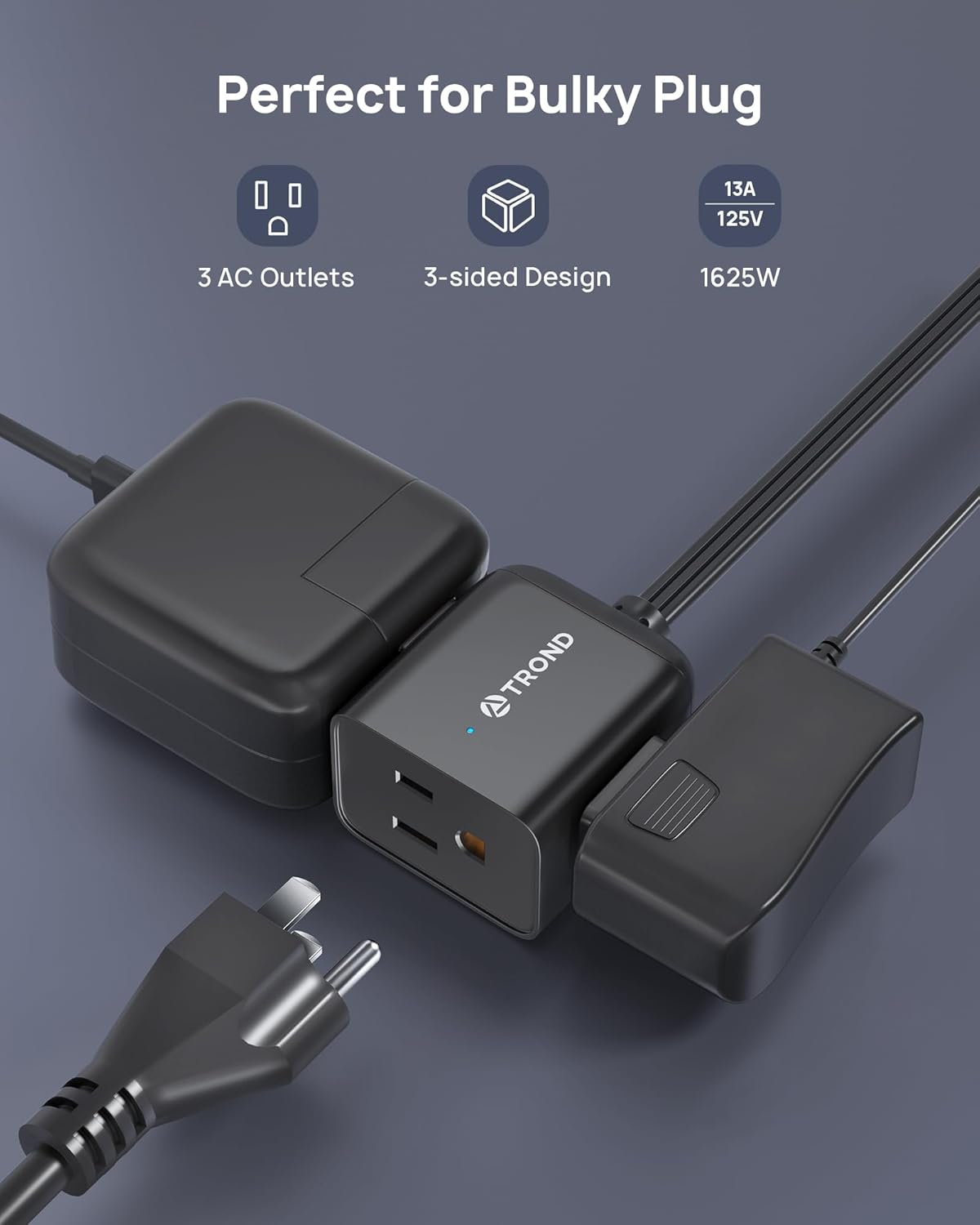 - Sleek 3-Sided Power Cube: Unlike traditional extension cord strips, the smart-looking electric black extension cord features 3 grounded outlets on different sides, allowing you to use bulky plugs without blocking adjacent outlets. Max 1625W (125V/13A)