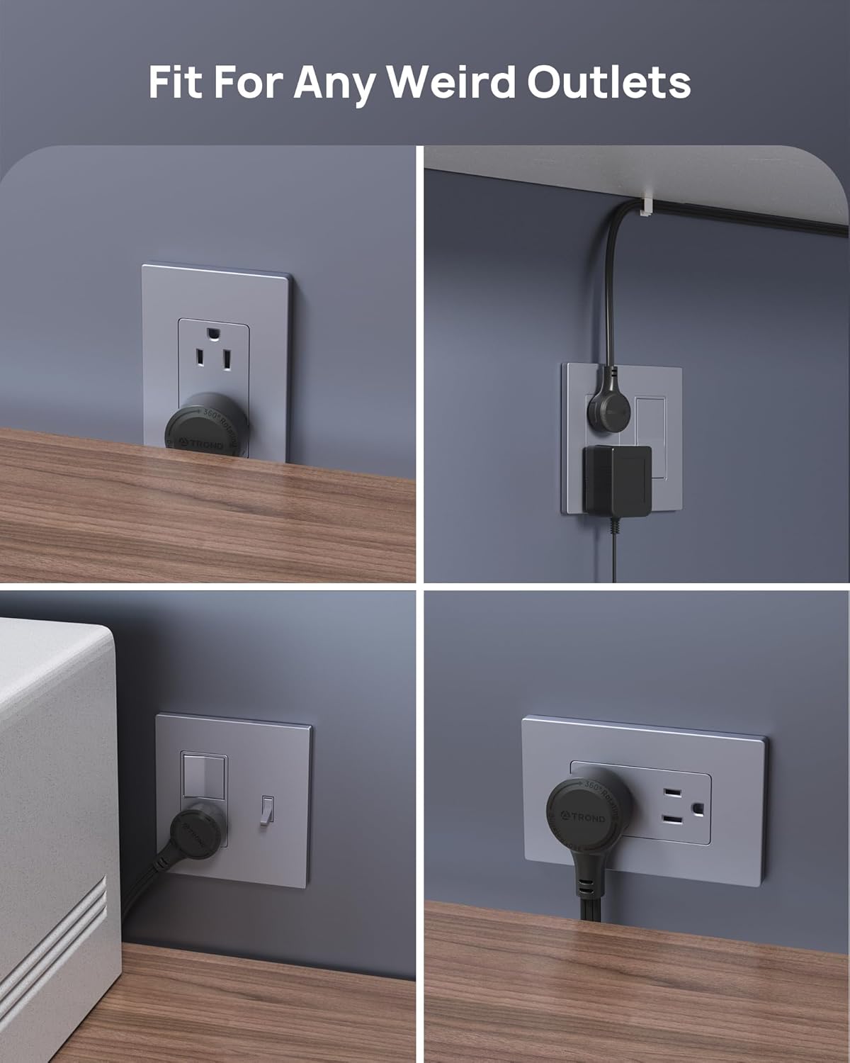- Patented 360° Rotating Plug: Built with a swivel wall plug(0.73in thickness), the low-profile flat extension cord 10 ft provides convenient access to any weird wall socket from all directions. Especially useful in confined areas like behind wall-mounted TVs. US Utility Patent No.: 11901685