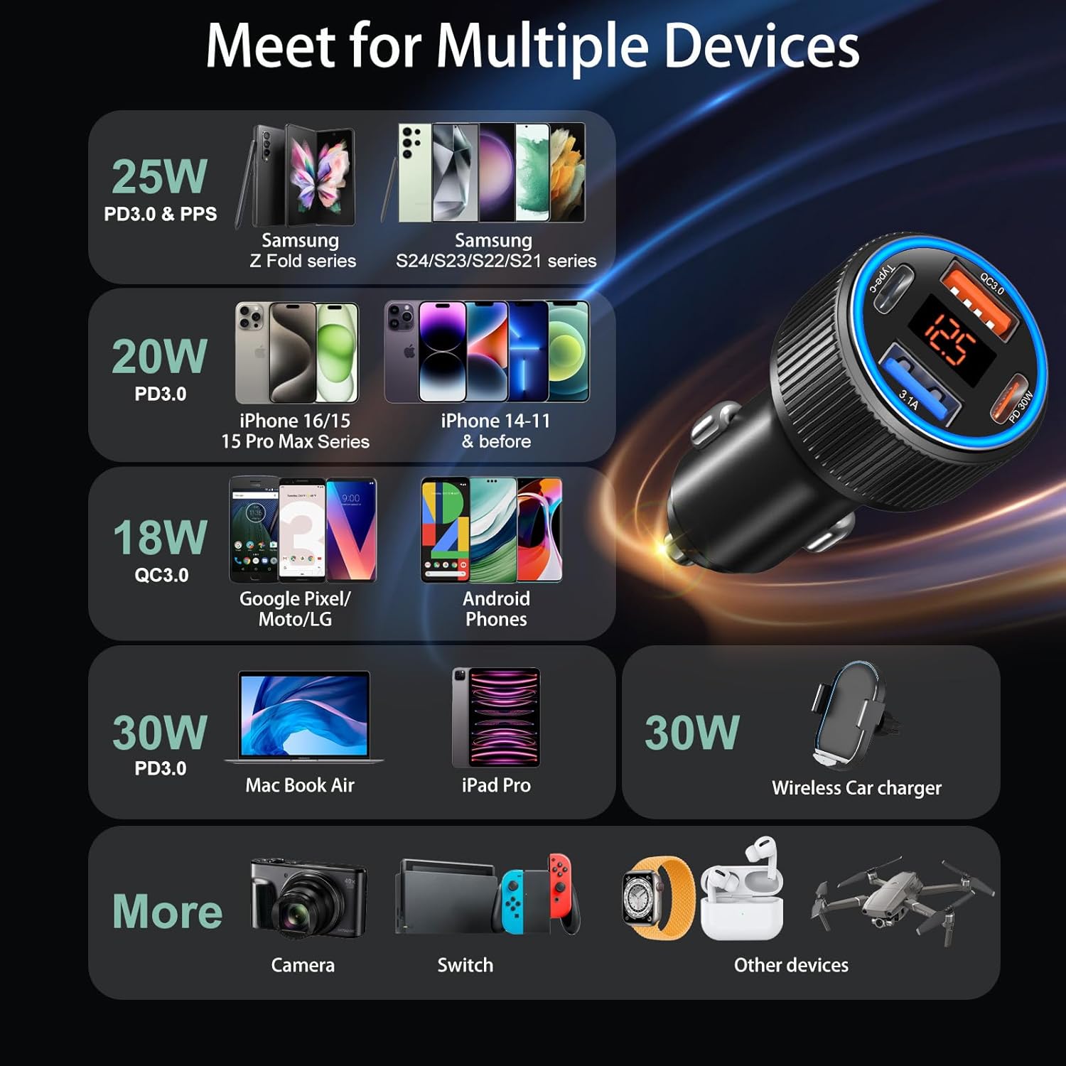 - [Wide Compatible] Wide range from dc 12V-24V(6A), the 12 volt usb c car charger outlet works great with smart phones, tablets, wireless car charger, dash cams, usb fans and other usbc and usb car accessories. Fast charge compatible with iPhone 16/15/14/13/12/11 Pro Max/Plus/Mimi; Pad Pro/Mini; iPhone XR/SE/XR/Xs/Xs Max/8/7 Plus,Galaxy S24/S23/S22/21/S20/S10/S9/S8+,Note 20/10/9/8, A03S 5G/A13/A14/A15/A53/A54/A71; Motor, L G phones, driving recorder, GPS navigation, car vacuum cleaner, power banks and other devices.