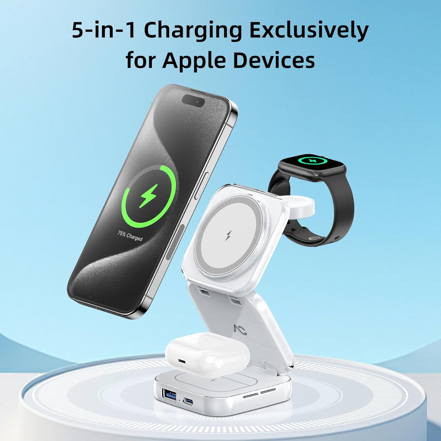 5-in-1 Wireless Charger for MagSafe, AC ISLAND Portable Travel Charging Station, 15W Max Fast Foldable Magnetic Stand, Evolved for iPhone 16/15/14/13 Series, Apple Watch, AirPods (with 35W Adapter)