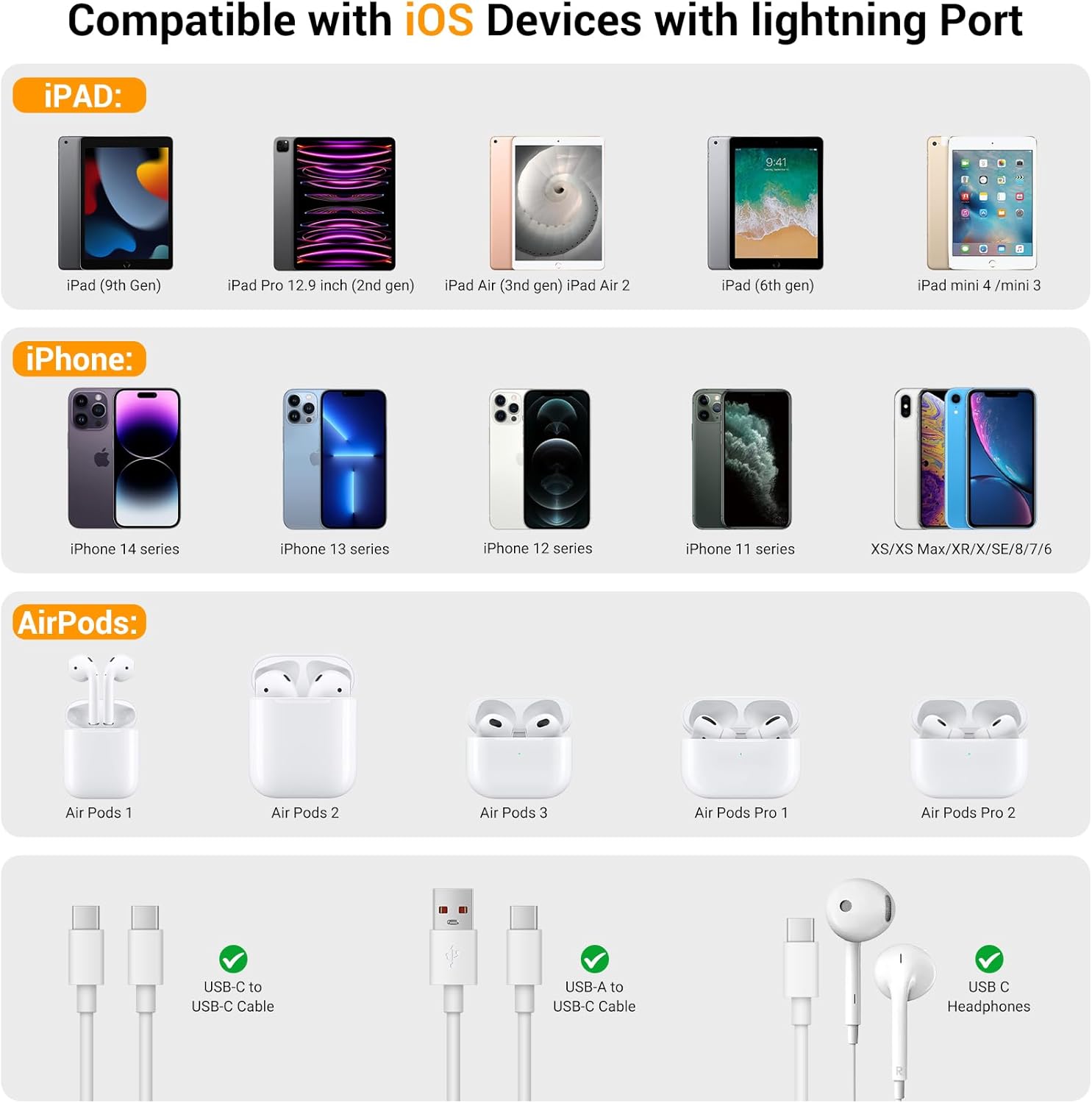 - 【Wide Compatibility】Compatible with iPhone models 14 through 5s—including iPhone SE/New SE/7/7 Plus/6/6 Plus/6s/6s Plus—iPad Pro (10.5" & 12.9"), iPad (5th & 4th generations), iPad Air (2nd generation), iPad Mini series (3rd & 2nd generations), iPod Nano (7th generation), iPod Touch (5th generation), AirPods and more.