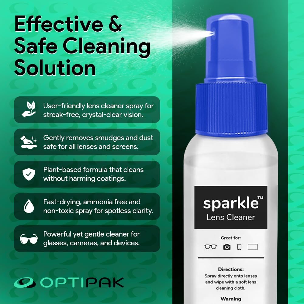 - Anti reflective Coating Safe: OPTIPAK’s eye glass cleaners spray kit for anti-reflective coated lenses, ensuring smudge-free, clear vision without damage. This glasses cleaning kit includes a glasses cleaner bottle and microfiber cloth, perfect for daily use.