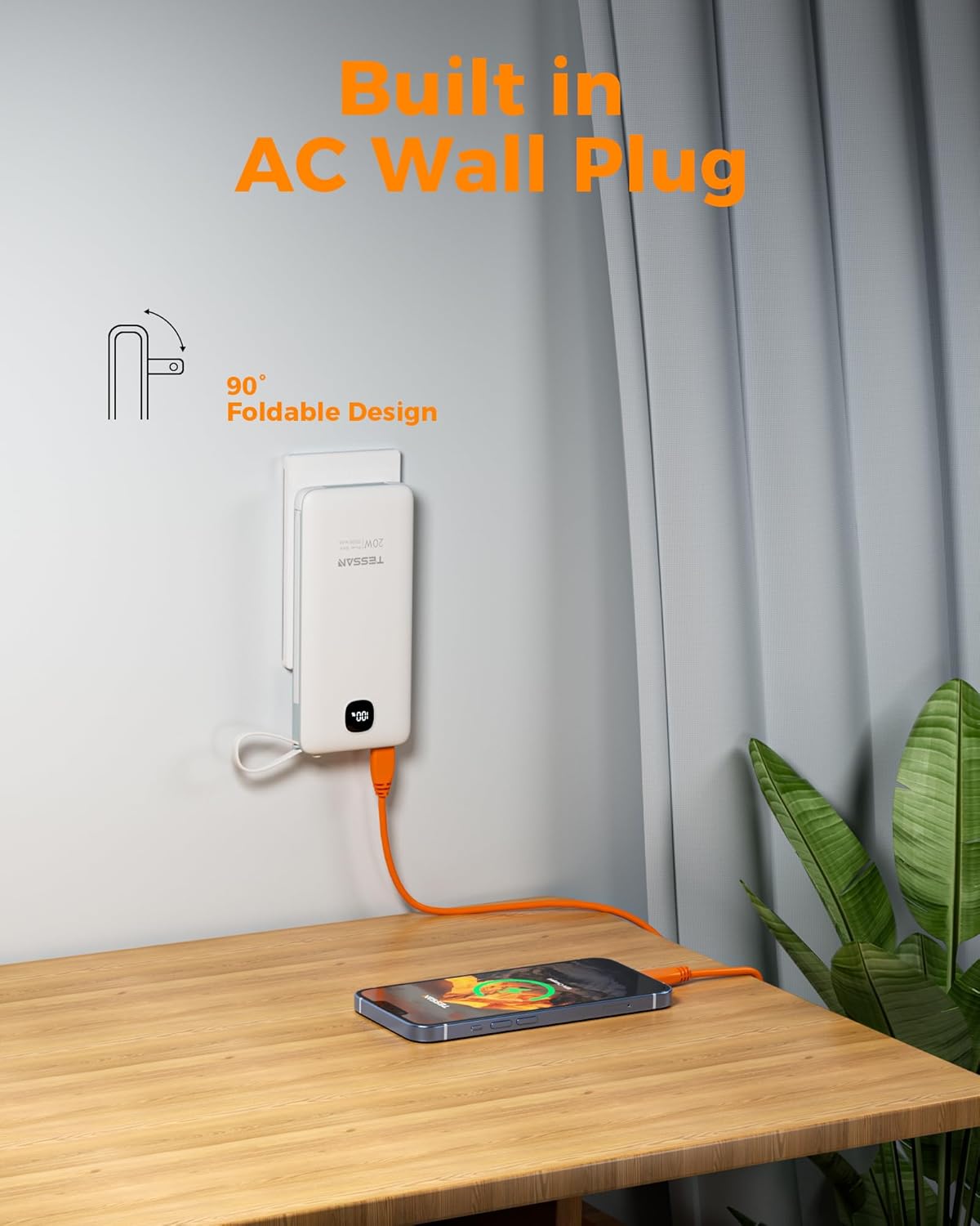 - Portable Phone Charger Built in Cable & Wall Plug: Conveniently charge your devices and the power bank for iphone itself with built-in cables and USB-C port. The integrated AC wall plug eliminates the need to carry additional adapters and cables,TESSAN battery pack simplifying your charging routine.