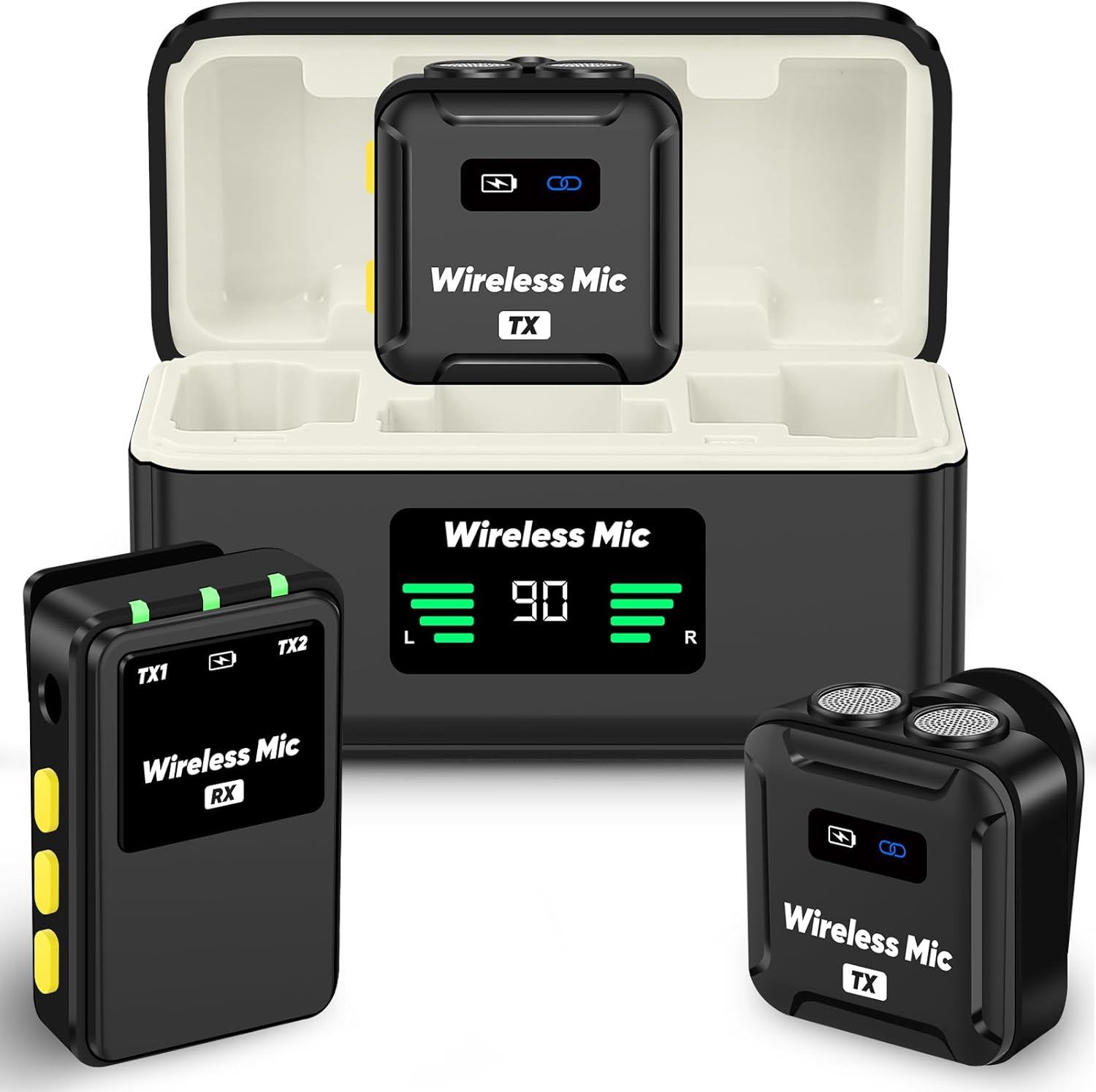 Wireless Lavalier Microphone (2 TX + 1RX + Charging Case) for DSLR Camera iPhone Android PC 656FT Range Professional Lapel Mic Wireless with 48KHZ/24Bit Clear Voice, 30Hours Vlogging