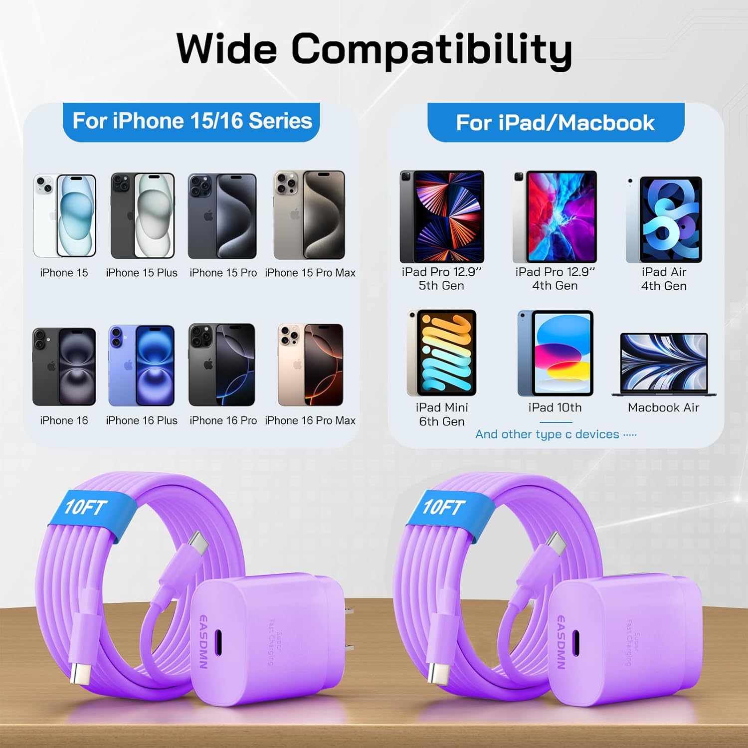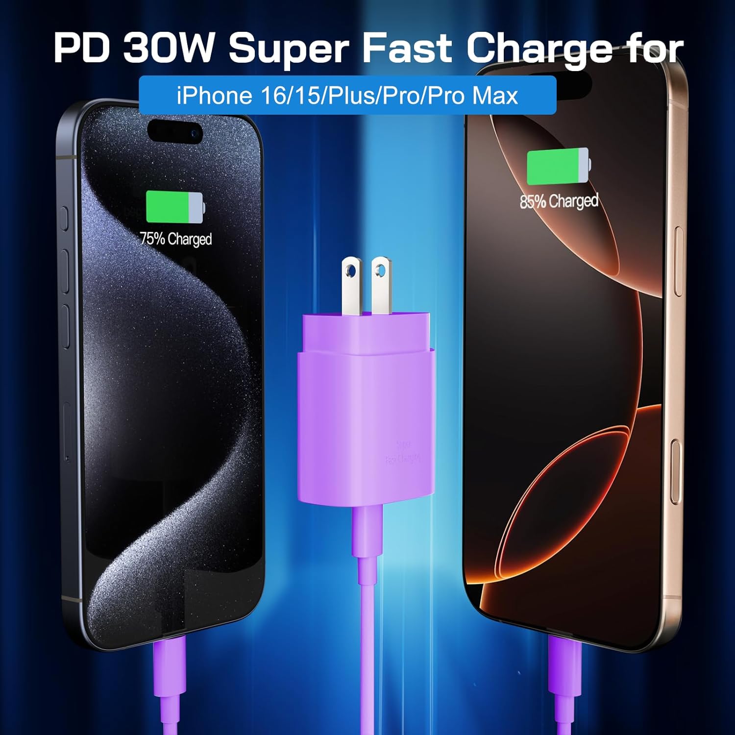 30W USB C i Phone 16 15 Charger Fast Charging, 2PACK Wall Charger for iPhone 16 15 Pro Max Charger Cord 10FT Fast Type C Charger Block for iPhone 16/16 Pro/15 Plus/15 Pro/15 Pro Max, iPad Pro, Purple