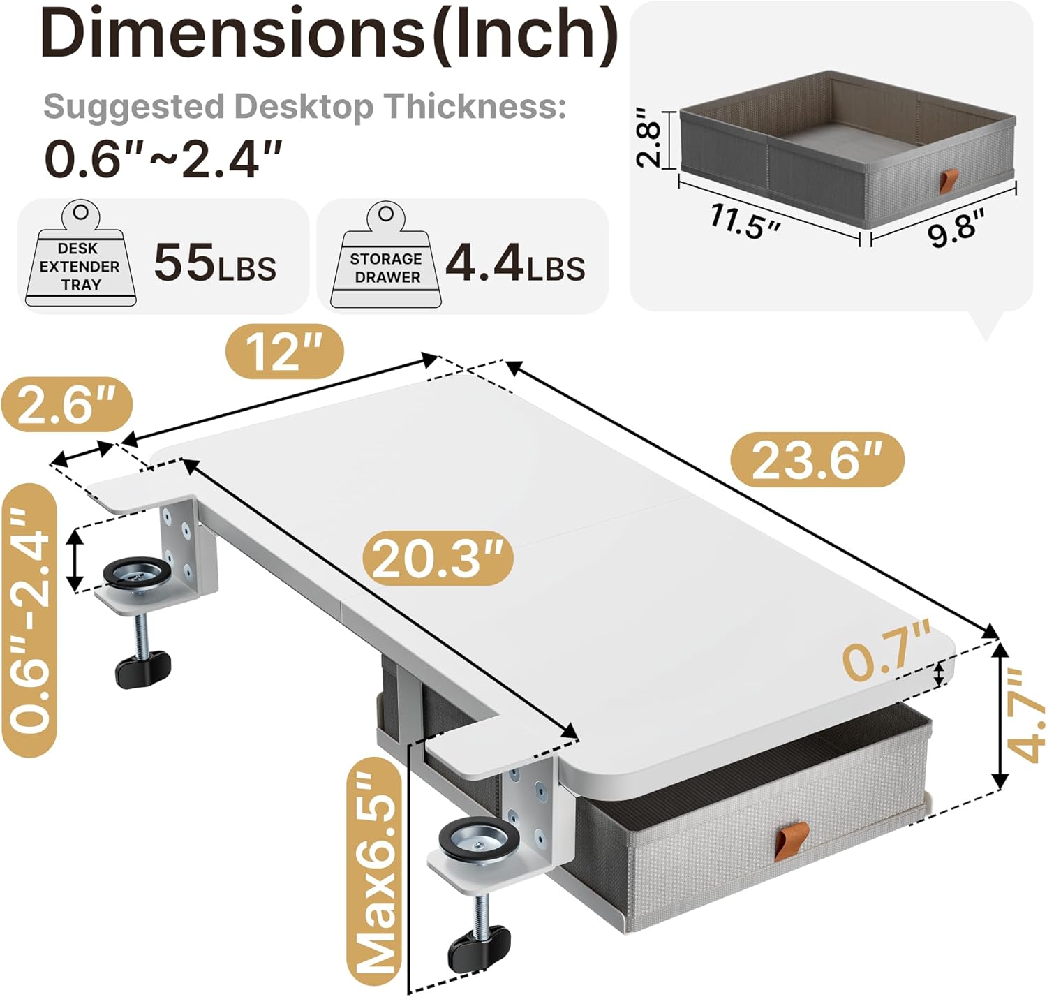 - QUICK AND SECURE INSTALLATION: The clamp-on design enables fast, damage-free installation and fits desks 0.6" to 2.4" thick and at least 22" wide. It can be mounted on the front or side of your desk to suit various workspace layouts. Not compatible with raised, beveled, or irregular desktop edges.