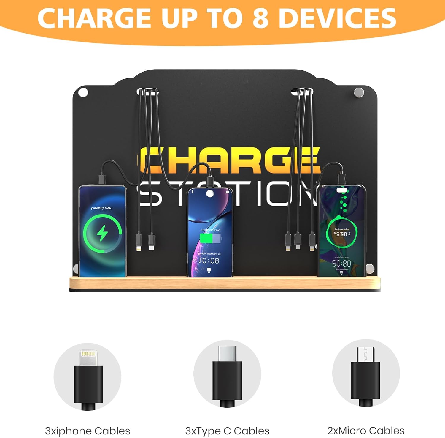 - Bamboo Tray: The bamboo base design get the charging station more Costly. Providing a larger space to hold smartphone or tablets,the Charging Shelf can power up to 8 devices at once including cell phones, iPhone, Android, smartphones. They are 3 iPhone cables, 3 Type C cables and 2 Micro cables.
