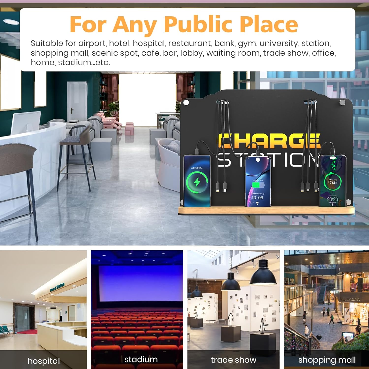 - Application: The charging station can be used for airport, hotel, hospitals, banks, shopping malls, lobbies, waiting rooms, trade shows, concerts, universities, classroom, stadiums, retail, corporate offices, home, events, etc.