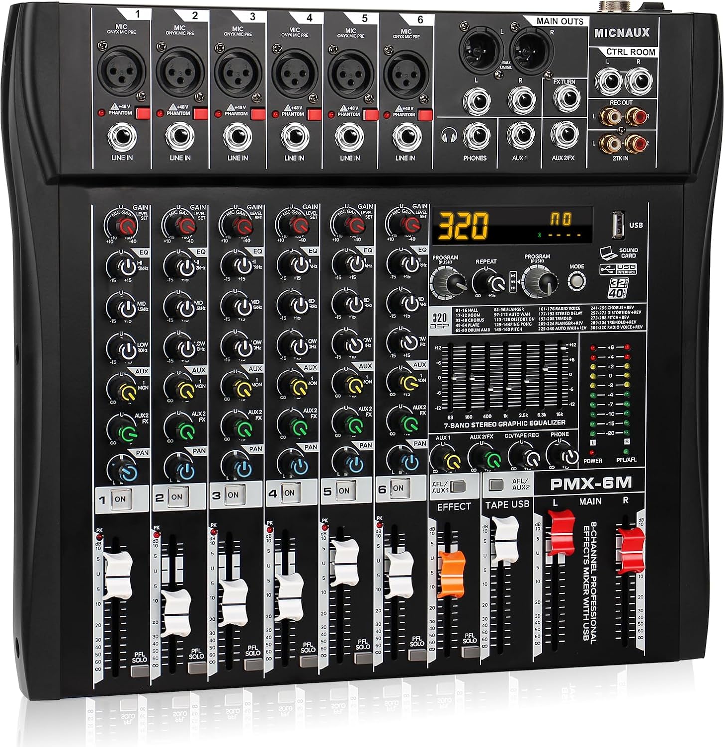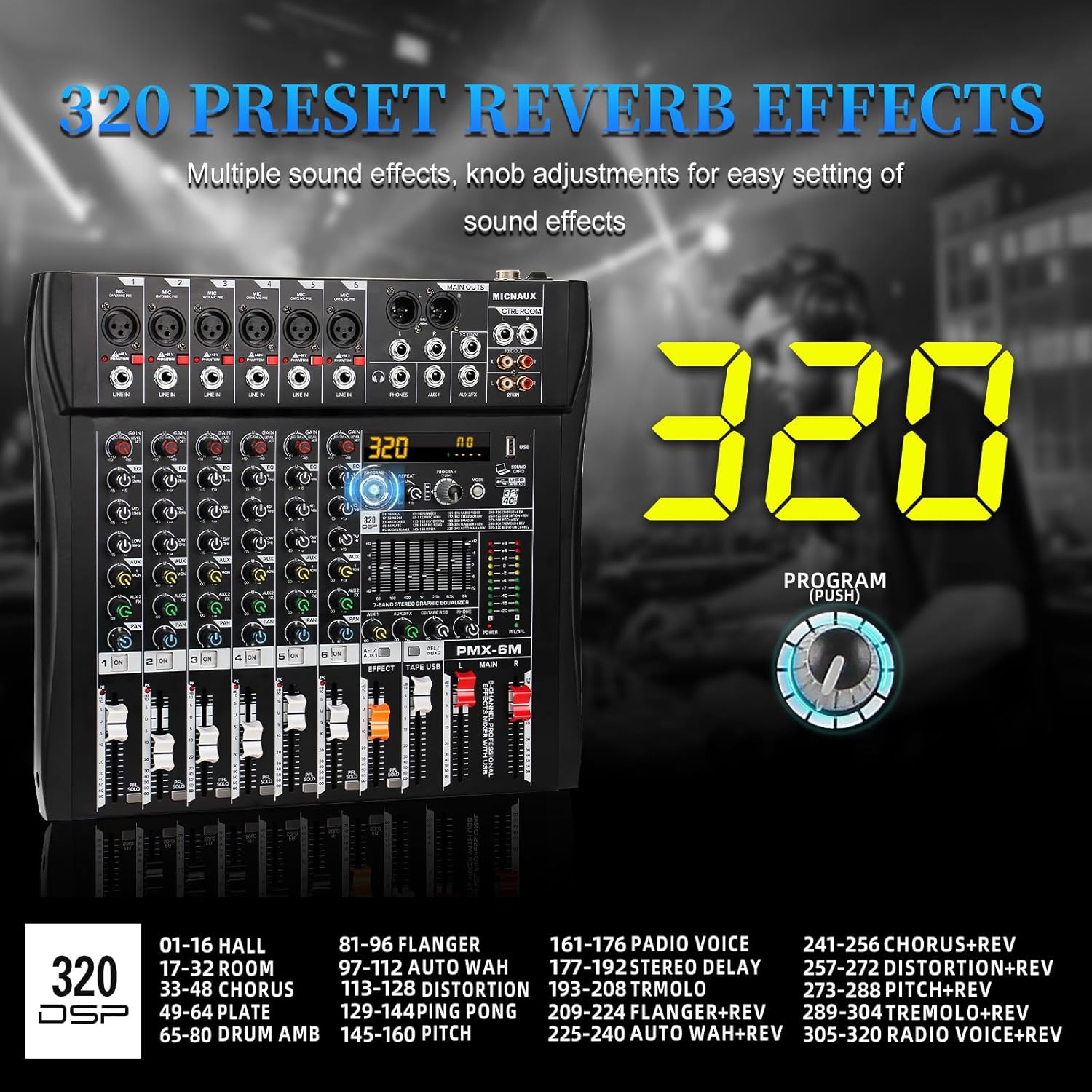 - 【320 DSP Effects】 This professional music mixer features 320 built-in DSP effects, designed for effortless switching to suit any scenario. Ideal for high-quality on-stage performances, live gigs, DJ events, karaoke, and parties, this mixer ensures your sound is always top-notch.