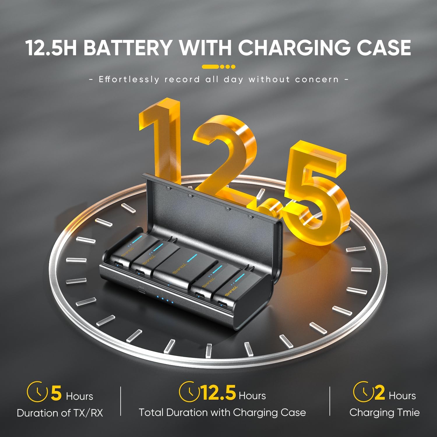 - 5 hours of operation on a full charge. With its compact charging case, you can recharge the entire set 1.5 times, with each full charge taking only 2 hours. This means that with the charging case, you can enjoy a total battery life of 12.5 hours. No more worrying about low battery situations