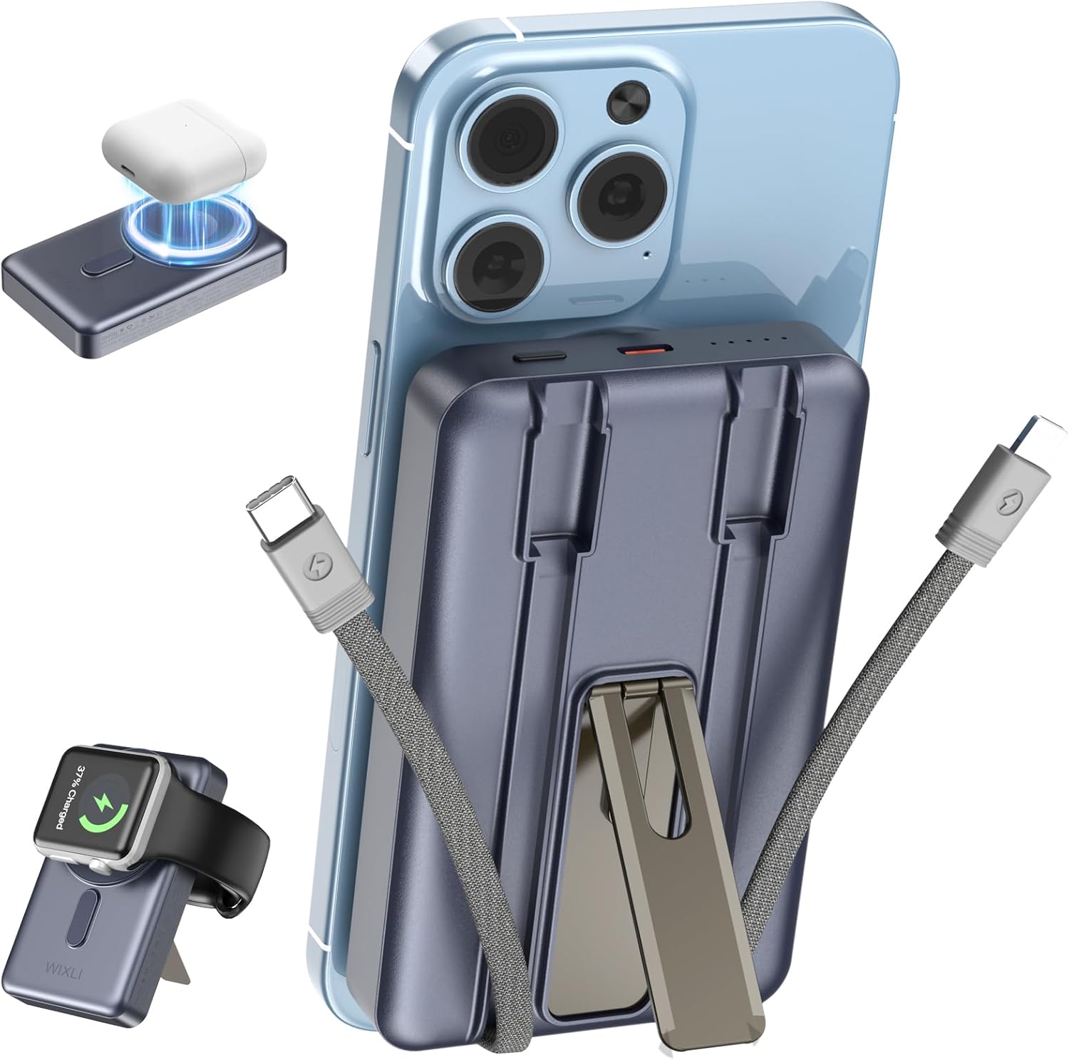 Wireless Portable Charger, 3-in-1 Magnetic Power Bank 10000mAh with USB-C and iOS Cable and Stand, 22.5W Fast Charging Battery Pack, Compatible with iPhone 16/15/14/13/12/Pro/Mini/Pro Max