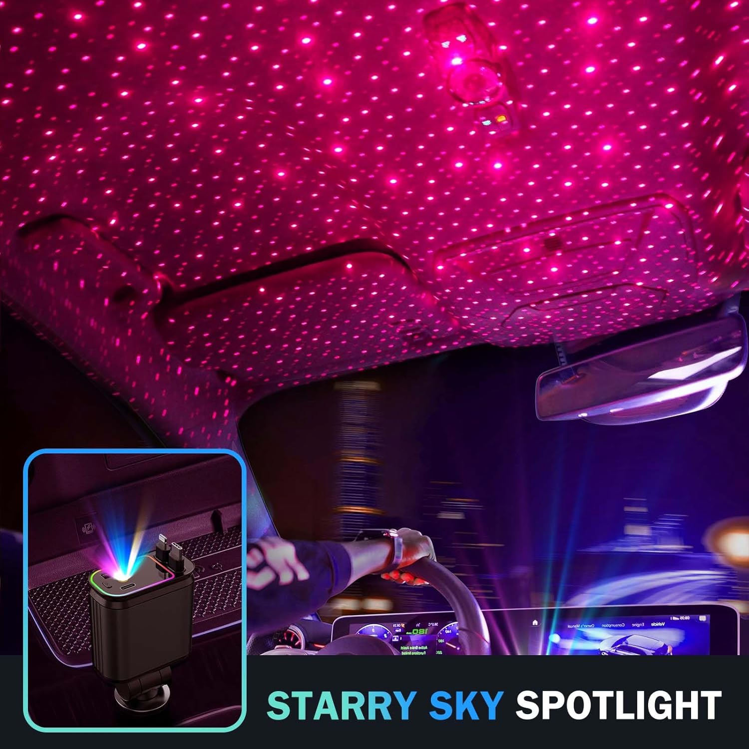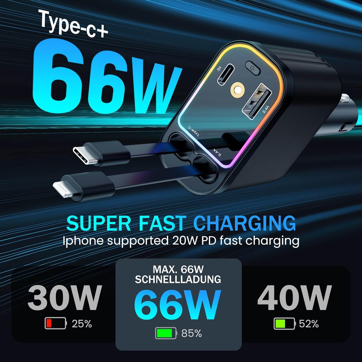 - [ Upgraded Car Charger ]:Car Charger with Starry Sky. The 4 in 1 car charger equippes with a real PD 66W Type-C retractable cable (fast charging port), and IOS retractable cable, and additional USB-C and USB-A ports, this charger offers fast charging for up to four devices simultaneously.