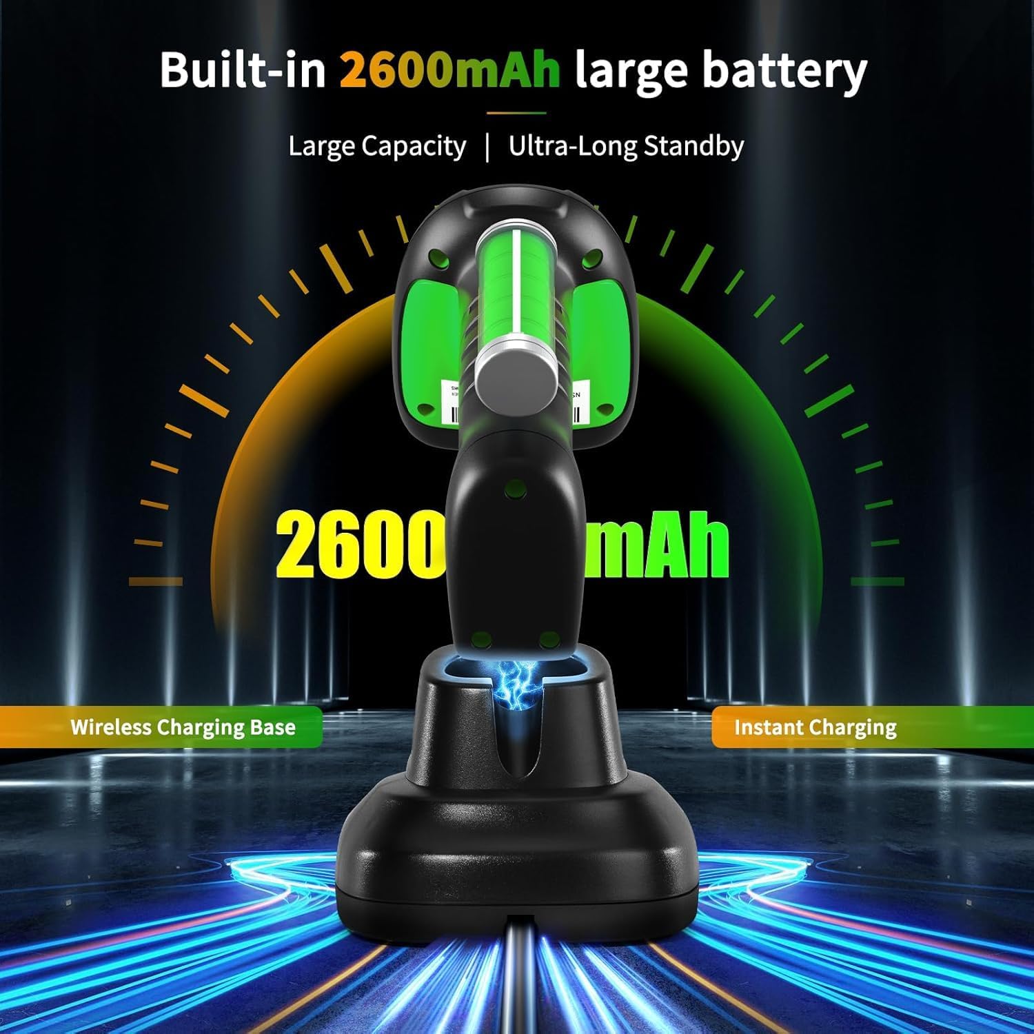 - [Dual Connectivity: 2.4G Wireless & Bluetooth] This barcode scanner supports both 2.4G wireless and Bluetooth connections. The included charging dock has a built-in 2.4G receiver, allowing for easy plug-and-play functionality. The scanner also supports Bluetooth connections in HID, SPP, and BLE modes, making it compatible with a wide range of devices, including laptops, PCs, smartphones, tablets, iPhones, iPads, and POS systems.