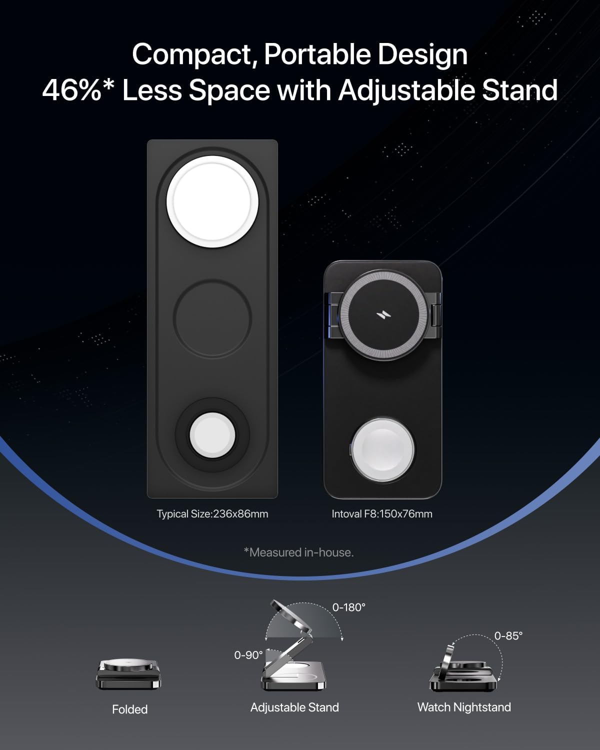- ๐๐จ๐ฆ๐ฉ๐๐๐ญ & ๐ ๐จ๐ฅ๐๐๐๐ฅ๐:Designed with portability in mind, the Intoval qi2 magnetic charger folds down to a compact 150x76mm sizeโabout 1/3 smaller than other similar products. Its sleek, foldable form makes it the perfect travel companion, easily slipping into your bag for convenient charging anywhere, anytime.