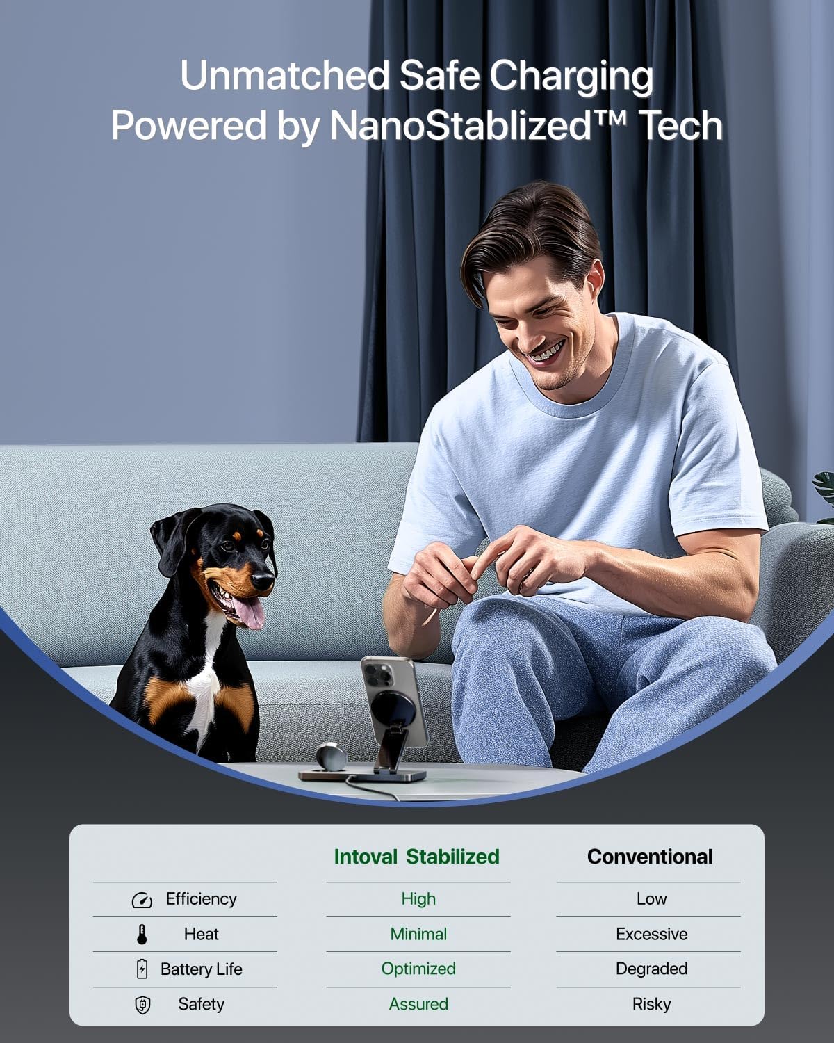 - ๐๐๐ฏ๐๐ง๐๐๐ ๐๐๐ง๐จ๐๐ฎ๐ฅ๐ฌ๐ ๐๐๐๐๐ญ๐ฒ:Powered by NanoPulse Monitoring, the Intoval 3-in-1 charger provides intelligent protection against overheating, overvoltage, and overtemperature. Built-in safeguards help maintain your deviceโs battery health and extend its overall lifespan. Charge with confidence, knowing your devices are protected every step of the way.