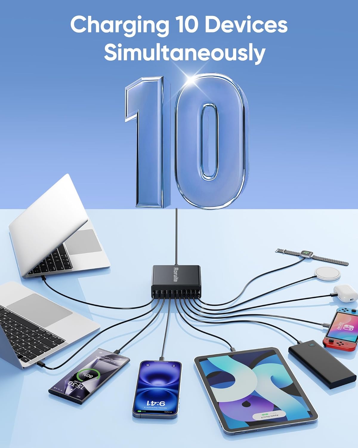- ă10-Port USB C Charging Stationă This USB C charger block from Roruite is the ultimate charging solution for multiple devices. Equipped with 6 USB-C charging ports and 4 USB-A charging ports, it offers a total output of 460W, allowing you to charge all your electronics simultaneously. Perfect for both home and office use, it saves you valuable outlet space and can support the charging needs of multiple people at once.