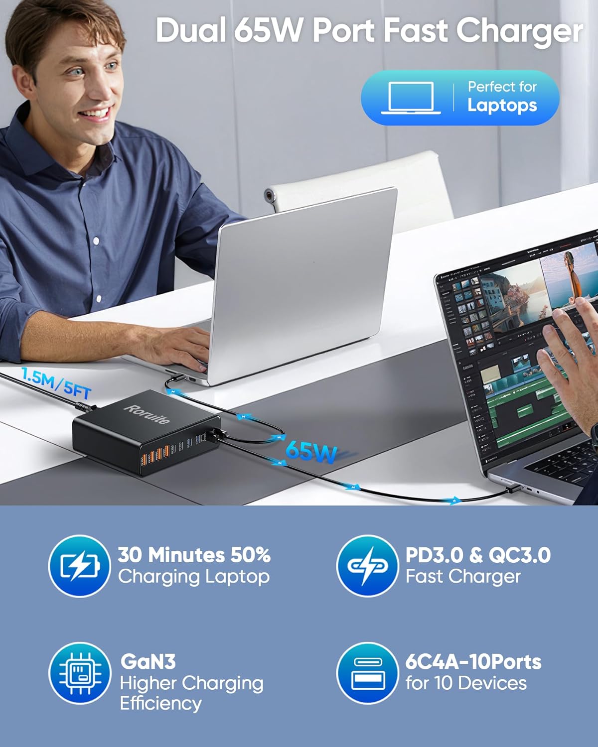 - ă6 Layers of Safety Protectionă The Roruite charging station uses advanced GAN III chip technology with built-in protection mechanisms for your devices. It includes 6 layers of safety features such as overheating protection, overvoltage protection, overcurrent protection, overload protection, overcharge protection, and short-circuit protection. This ensures your devices are charged safely and efficiently, providing peace of mind while you power up your electronics.