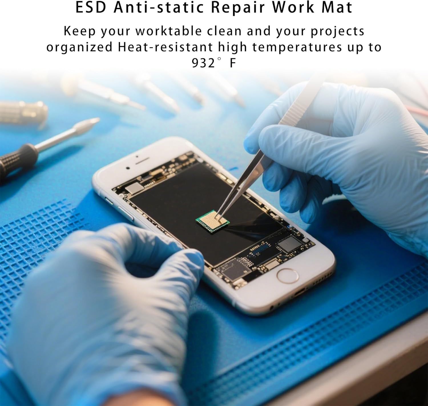- High Temperature Heat Resistant Soldering Mat - The anti-static mat with size 15.7'' x 11'', the working area is 15'' x 7.8'', not very big, but enough for personal maintenance work pad, it provide big space to satisfy your many projects like for repairing mobile phone, computer circuit board, ipad, camera so on different size electronics, this anti-static mat withstand high temperatures 932°F (500°C), which can protect your workbench from burning and ruining