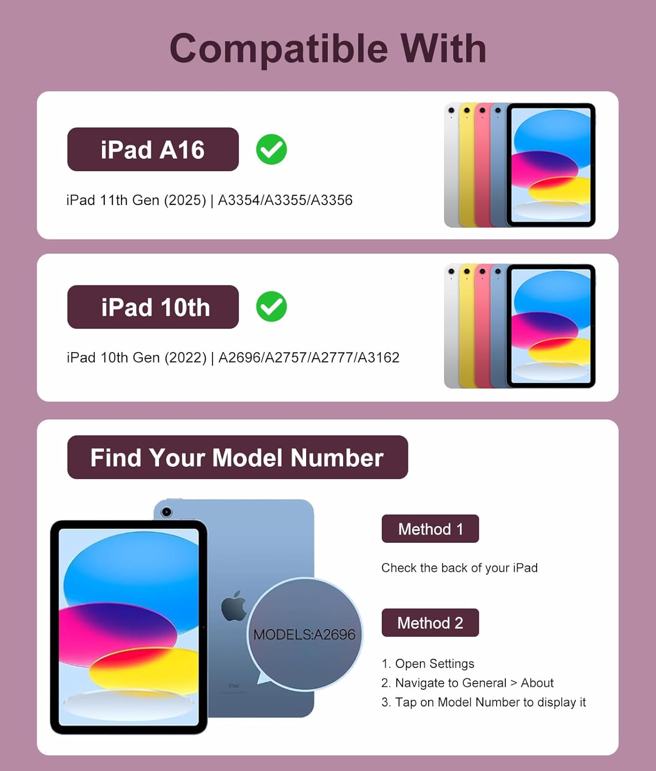 - For iPad 11th/10th Generation Case with Keyboard: This keyboard case compatible with iPad (A16 ) 11th Generation 11-inch 2025 (Model Number: A3354/A3355/A3356), compatible with iPad 10th Generation 10.9 inch 2022 (Model Number: A2696/A2757/A2777/A3162). NOT compatible with any other tablet models. Please check the model number starting with "A" on the back of your tablet before purchasing