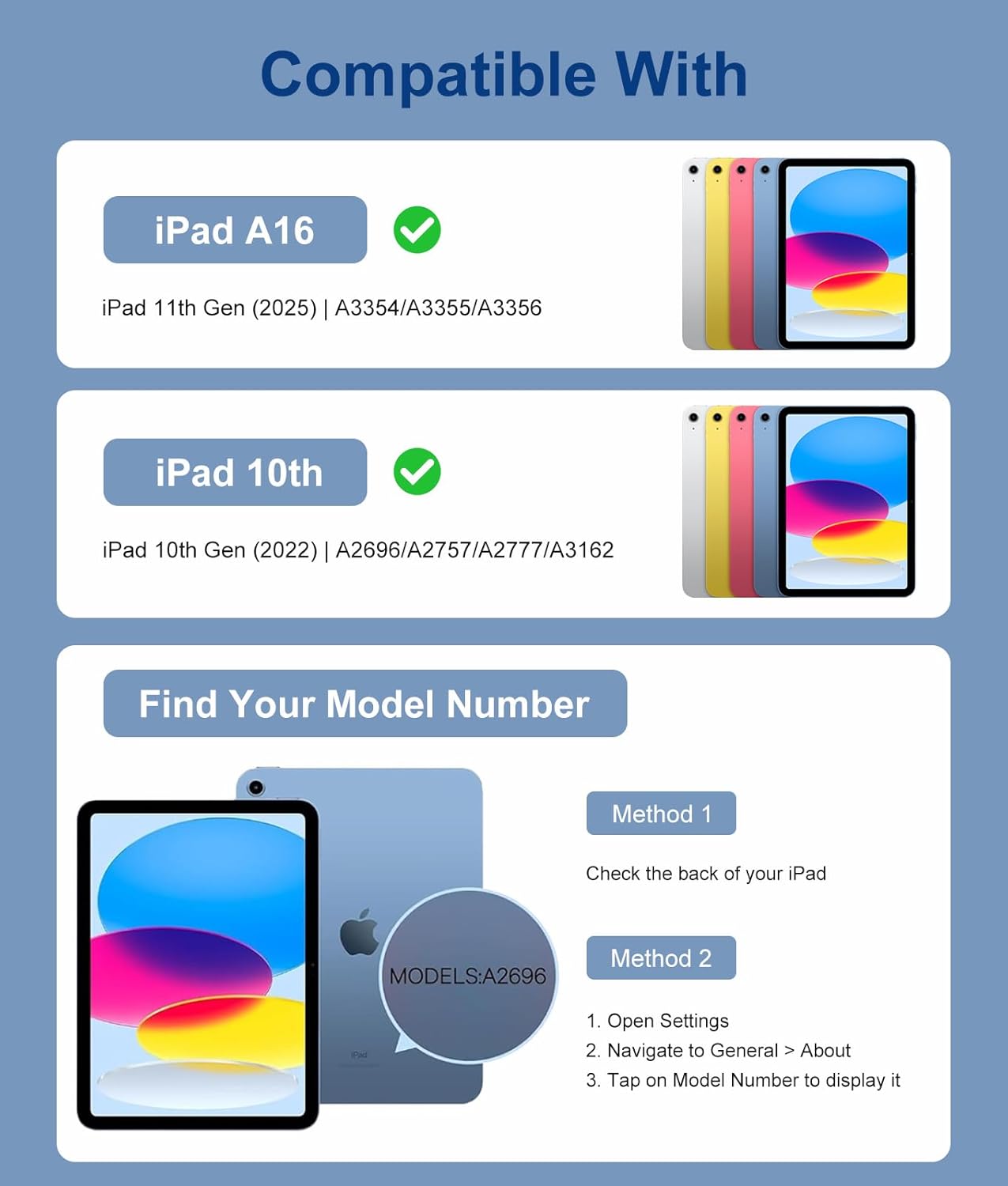 - For iPad 11th/10th Generation Case with Keyboard: This keyboard case compatible with iPad (A16 ) 11th Generation 11-inch 2025 (Model Number: A3354/A3355/A3356), compatible with iPad 10th Generation 10.9 inch 2022 (Model Number: A2696/A2757/A2777/A3162). NOT compatible with any other tablet models. Please check the model number starting with "A" on the back of your tablet before purchasing