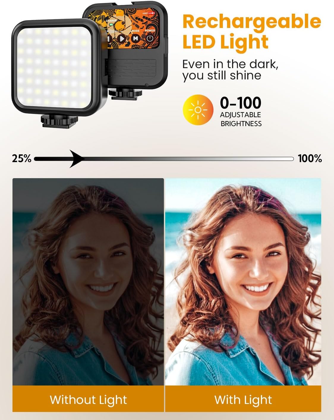 - 【3-color Adjustable Fill Light】 It is a rechargeable LED light with a built-in battery, offering a color temperature range of 3000K to 7000K t It’s an excellent tool for enhancing photo lighting and adjusting video brightness. Even at night, it ensures your beauty shines through.