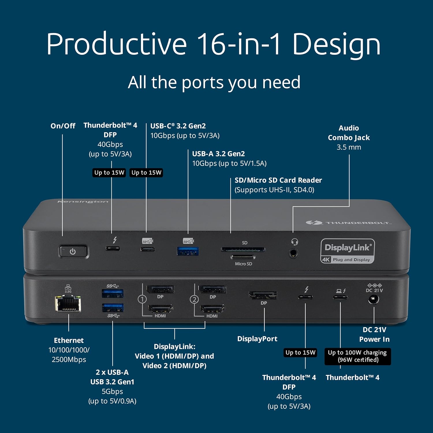 - Productive 16-in-1 Design - Includes 2 x downstream Thunderbolt 4 ports (40Gbps) capable of data, video, and audio (5V 3A), 1 x USB-C 3.2 Gen2 10Gbps (5V 3A), 1 x USB-A 3.2 Gen2 10Gbps (5V 1.5A), 2 x USB-A 3.2 Gen1 5Gbps (5V .9A), 2 x HDMI/DP, 1 x DP, 1 x 3.5mm combo audio jack, 1 x SD Card reader, 1 x Micro SD Card reader, and 1 x 2.5Gbps Ethernet