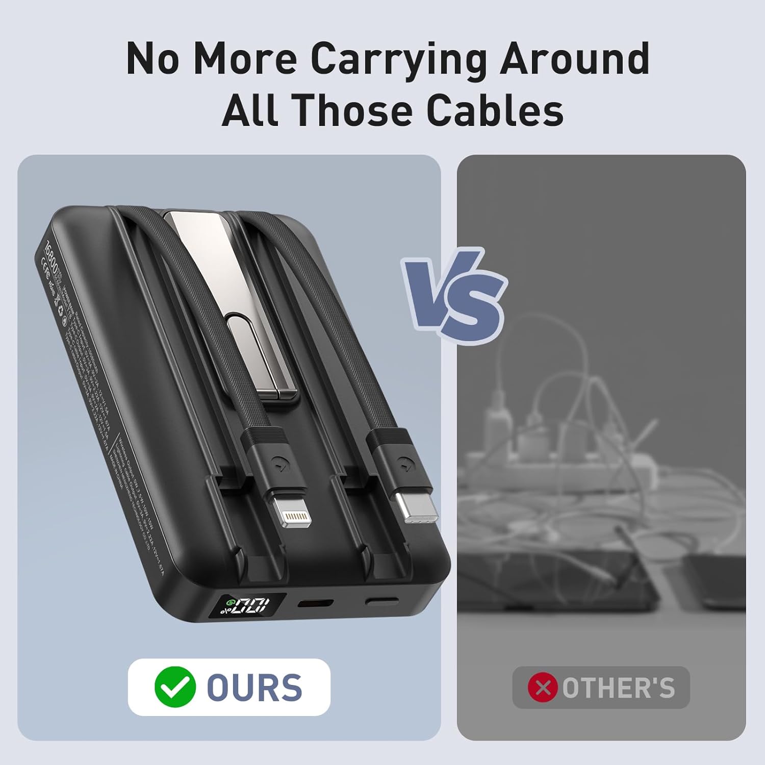 - 【Portable charger with built in cables】Slim portable charger built-in 2 cables included 1 * USB-C cable, 1 * IOS cable and 1 * Magnetic charging port and 1 USB-C Input/Output .Total 4 outputs can charge almost for all types port devices. Such as for iPhone, iPad, for Samsung, for other USB C port phones, tablets. All in one portable charger, you would not need to carry various cables any more!!!